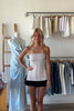 Black, low rise mini skirt with ruffled tiers and elastic waistband
