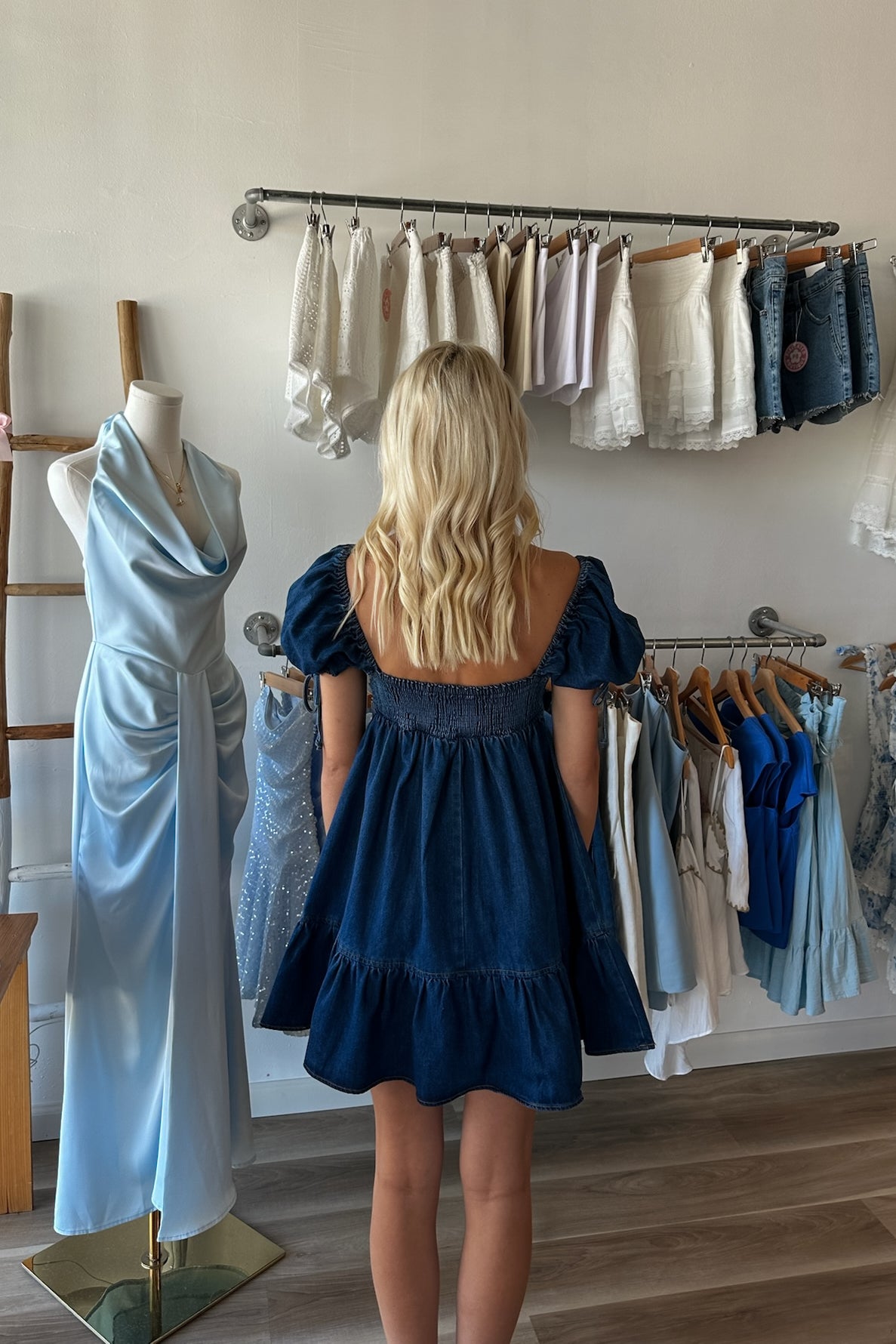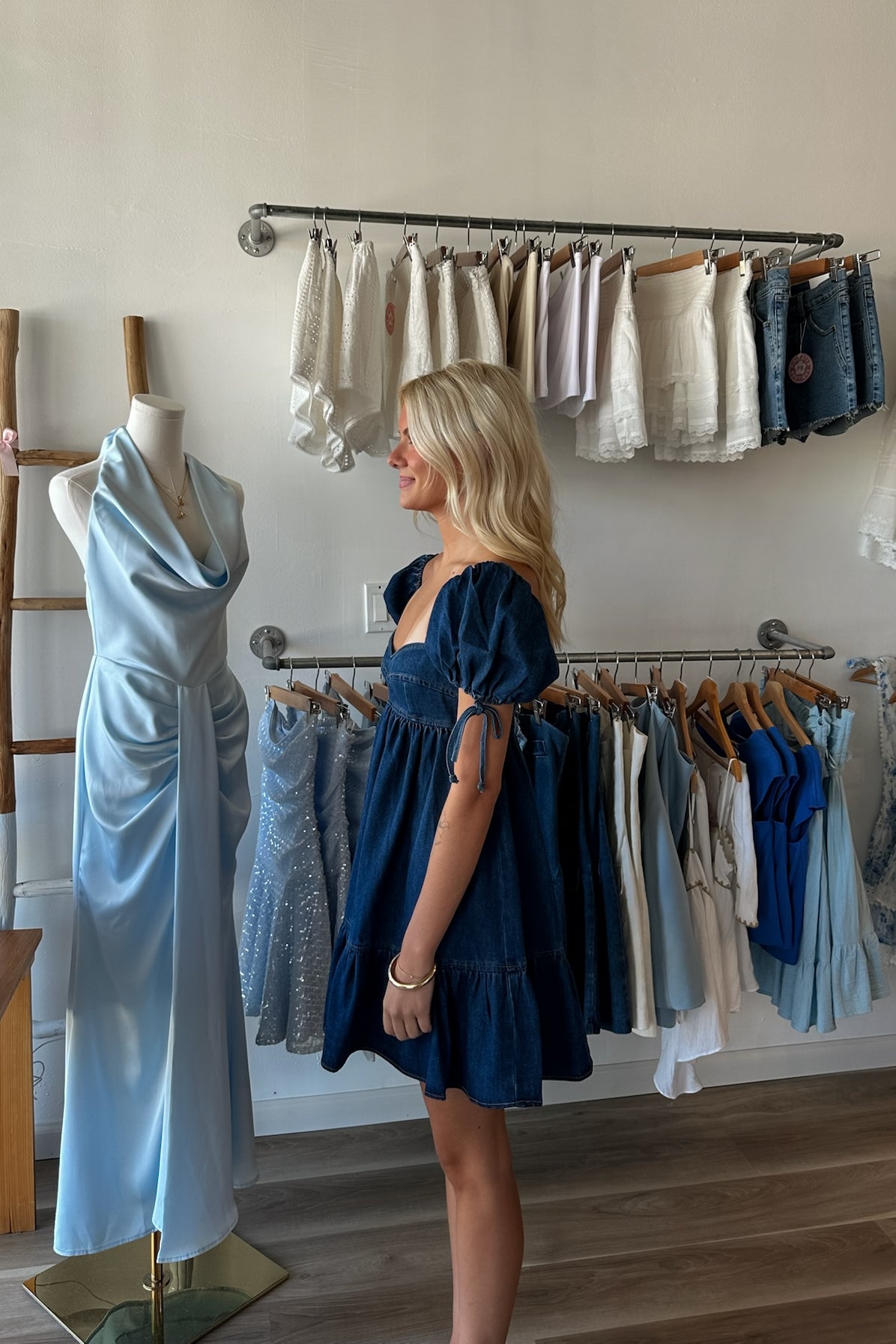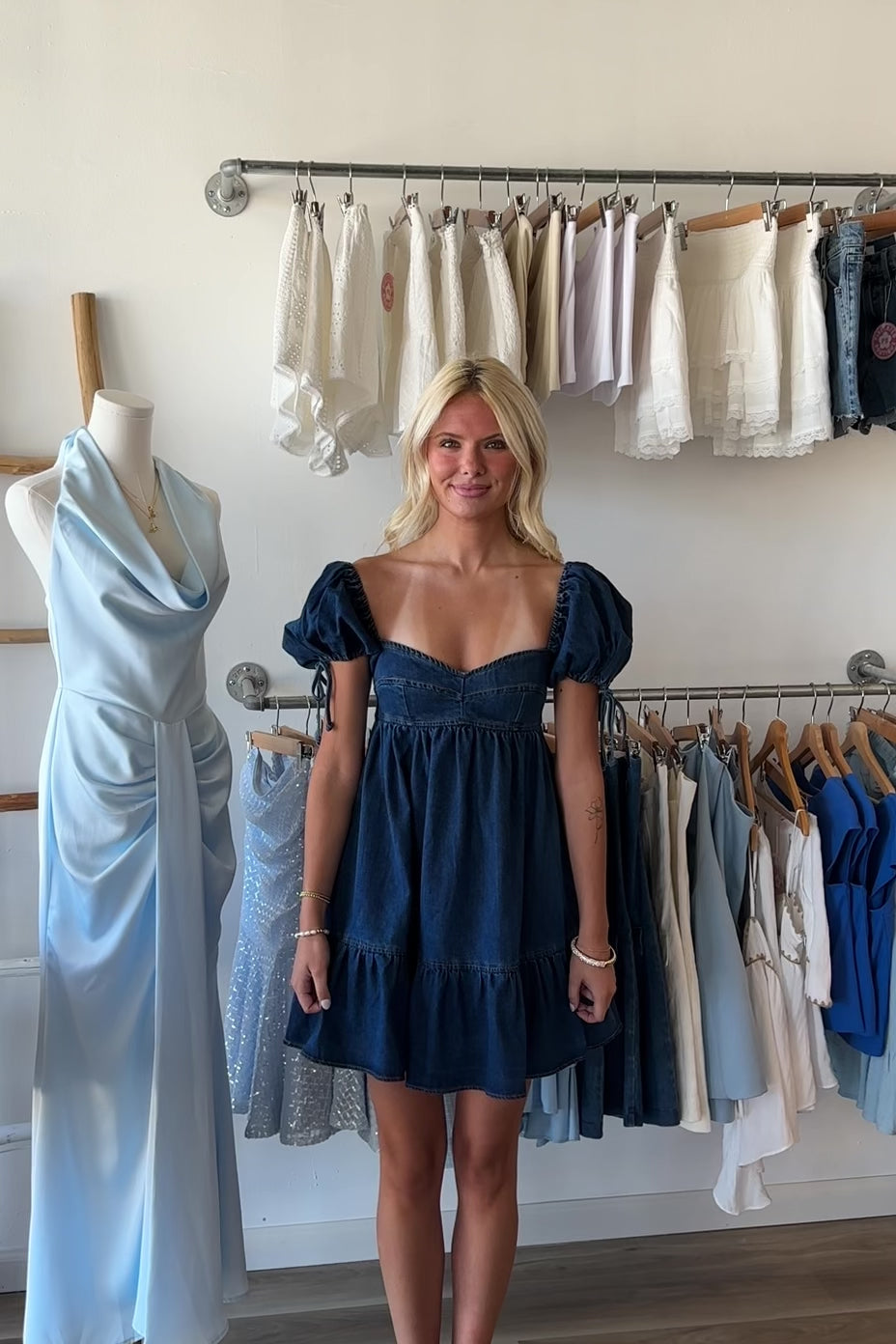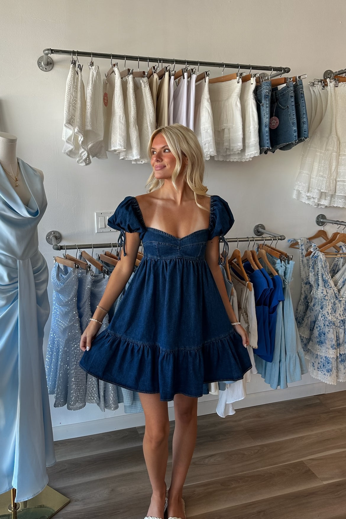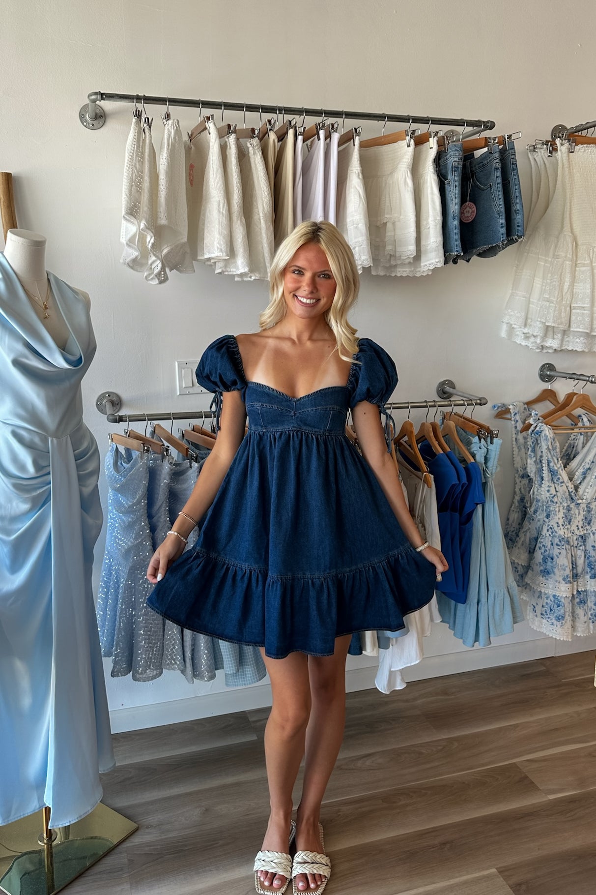 Blue, denim babydoll dress with puff sleeves and ties, sweetheart neckline, smocked back, and tiered hem