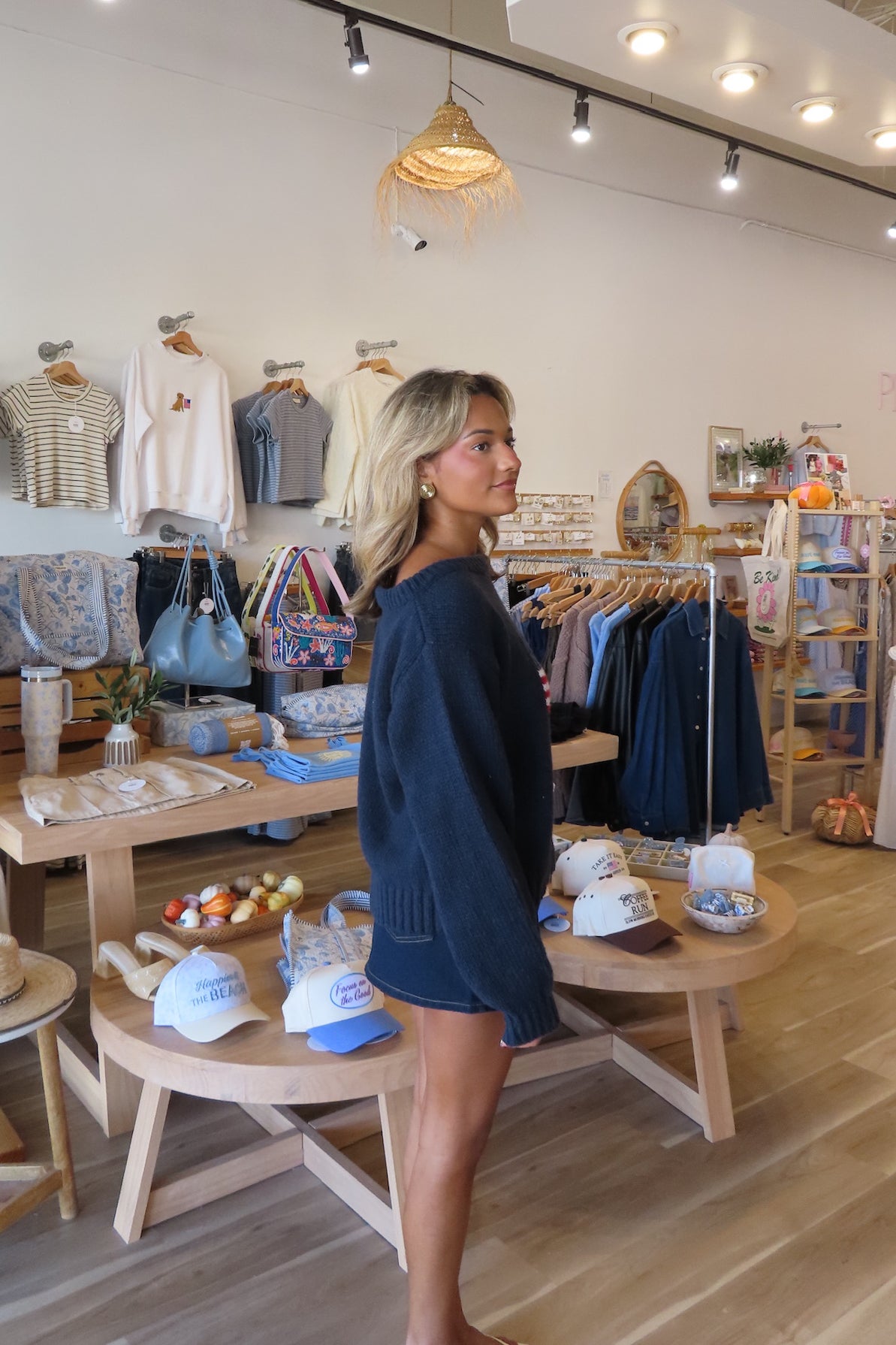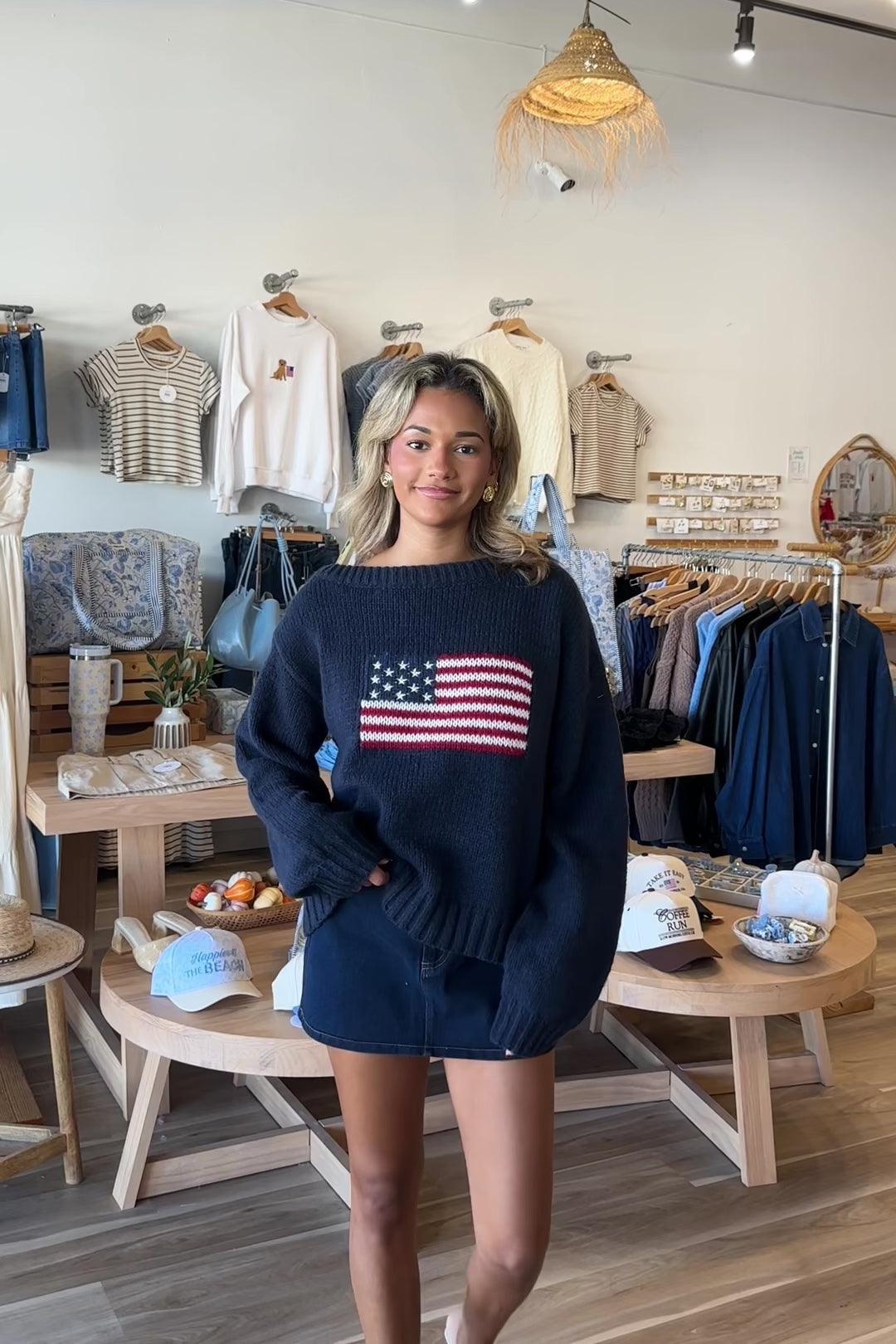 Blue, American flag sweater with boat neckline, ribbed hem, and oversized fit