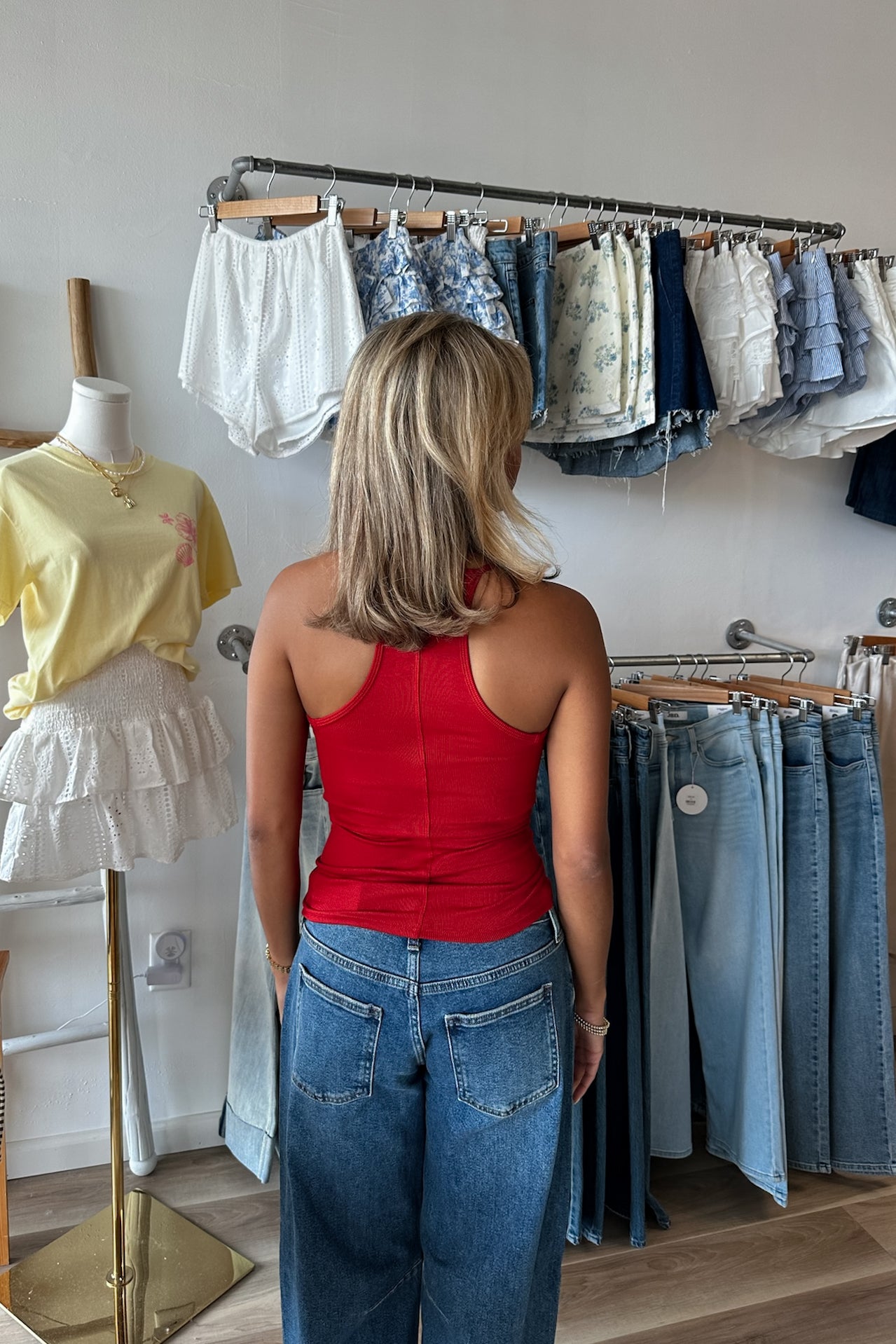 Red, tank Top with round neckline, ribbed fabric, and racer back