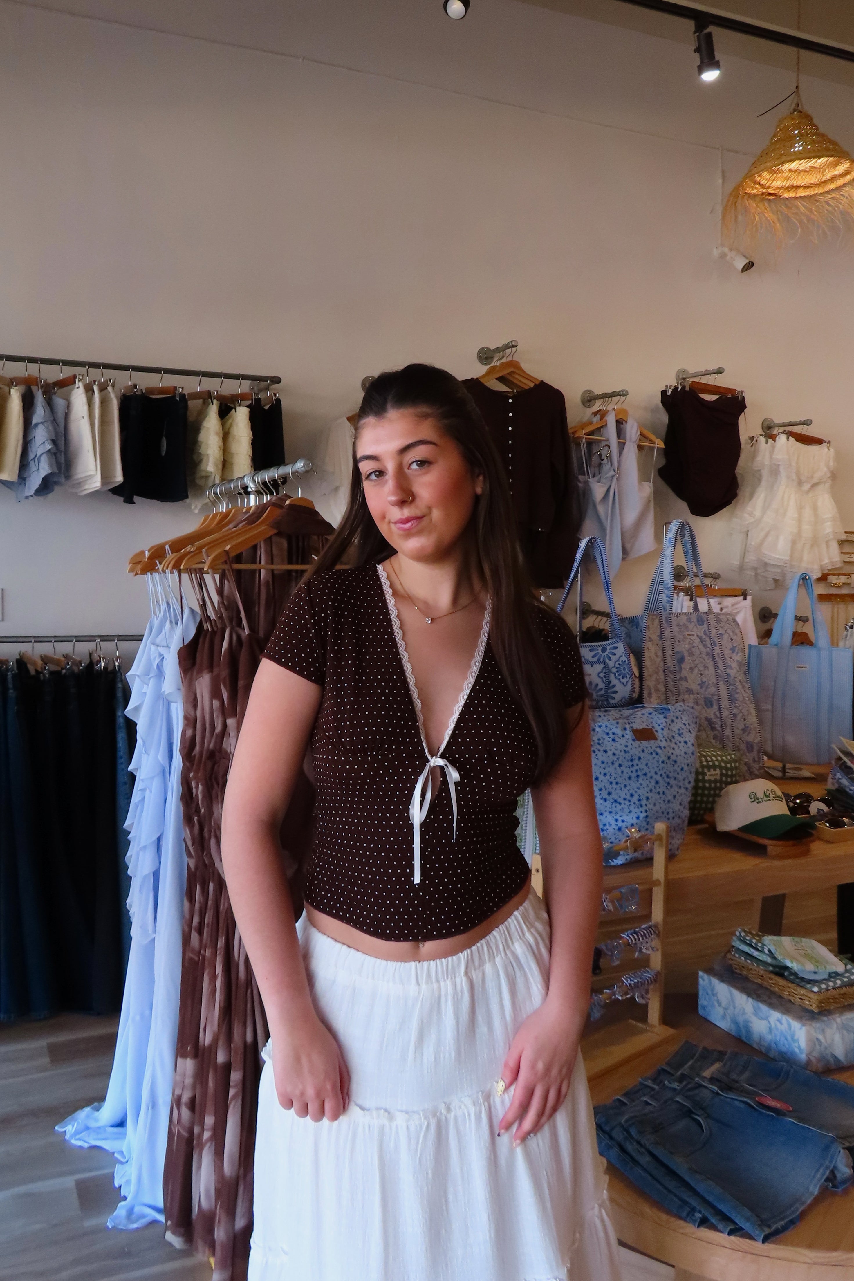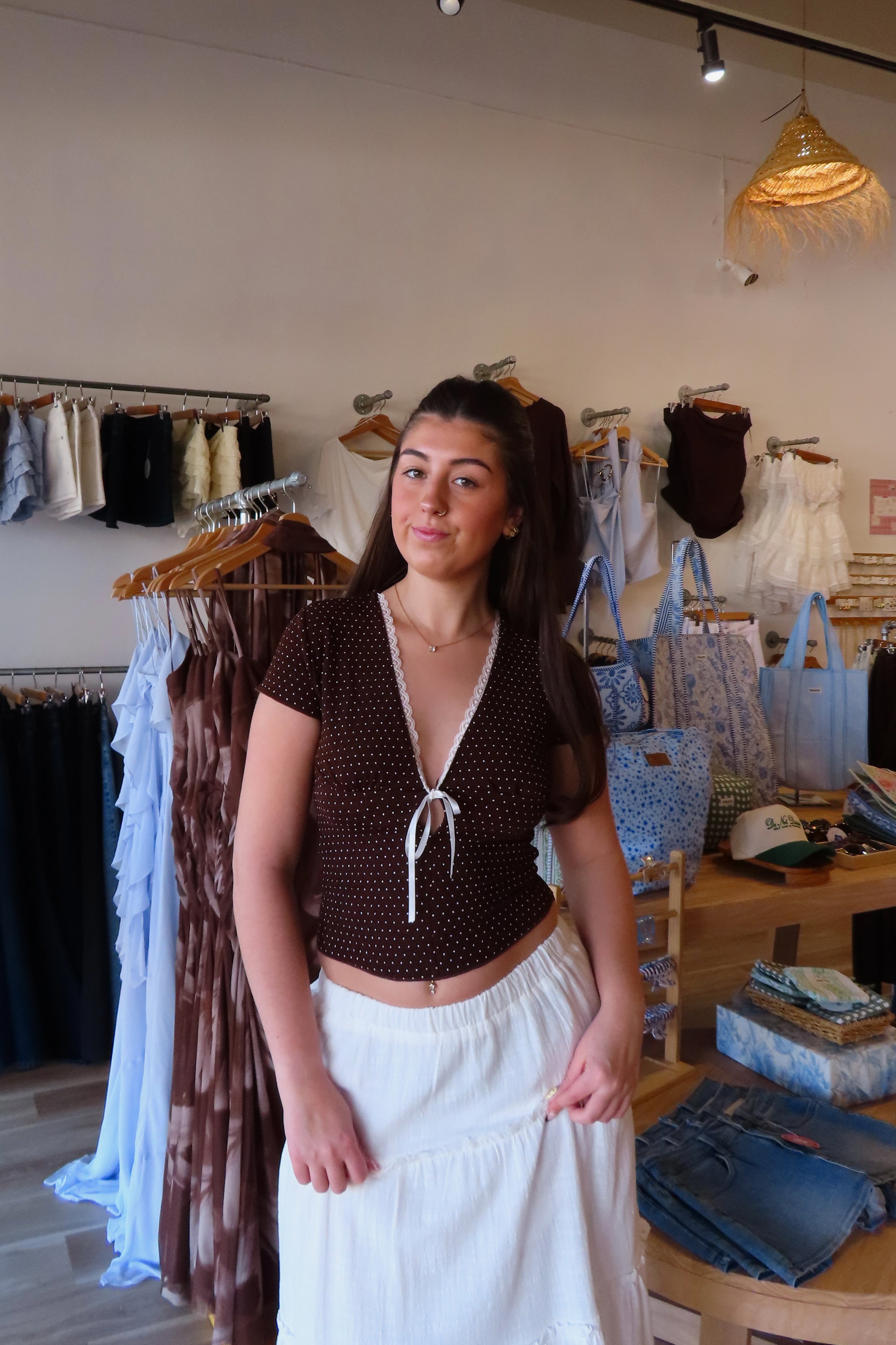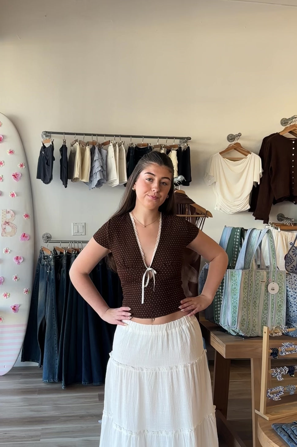 Brown, polka dot top with V neckline, front bow, keyhole cutout and lace trim