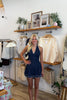 Blue, halter neck mini dress with front bow, lace trim, ruffled tiers, and back zipper