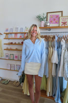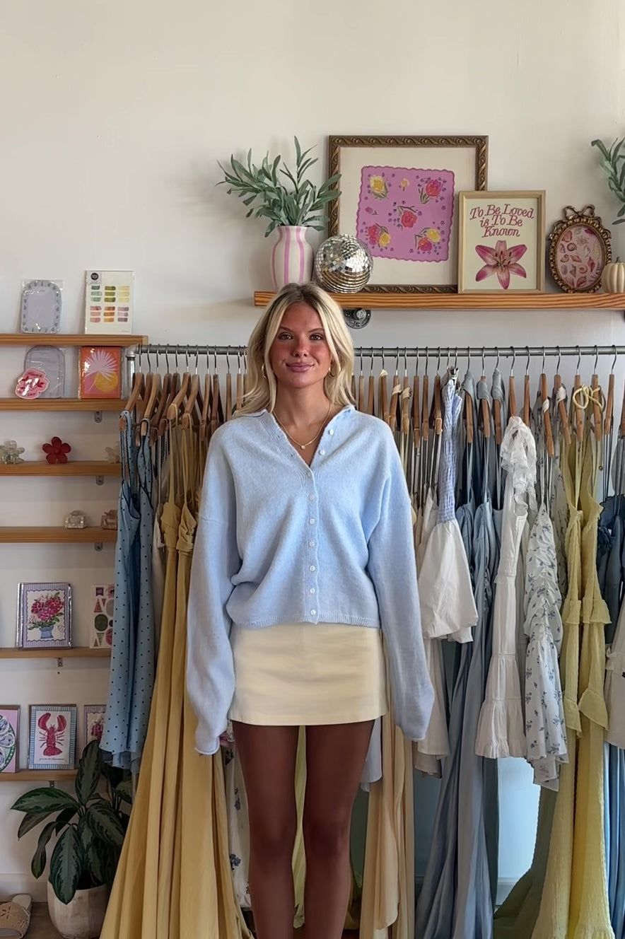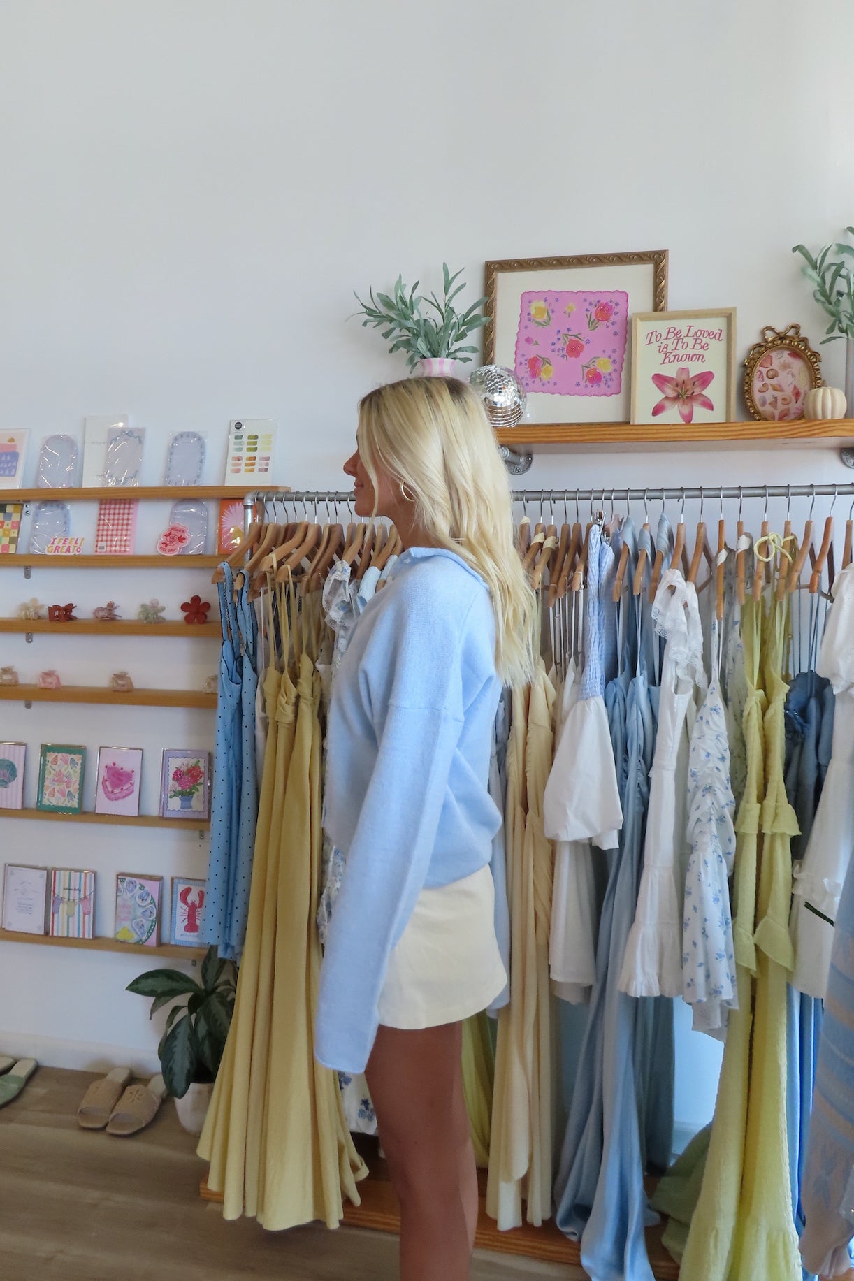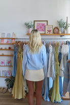 Blue, rolled collar cardigan with button down, drop shoulder, and ribbed hem