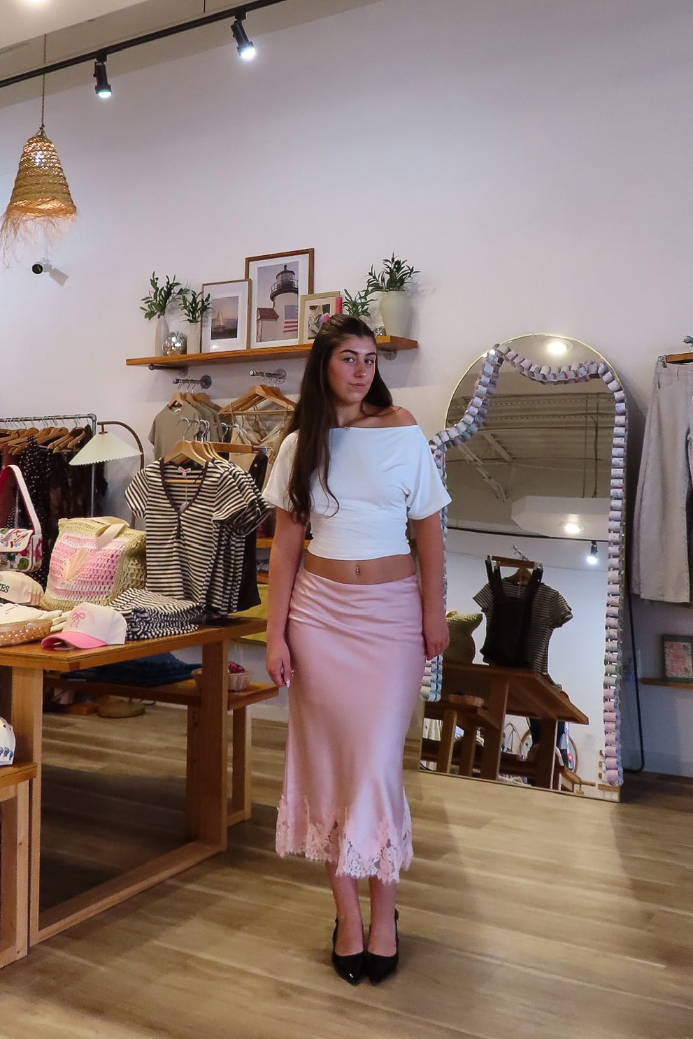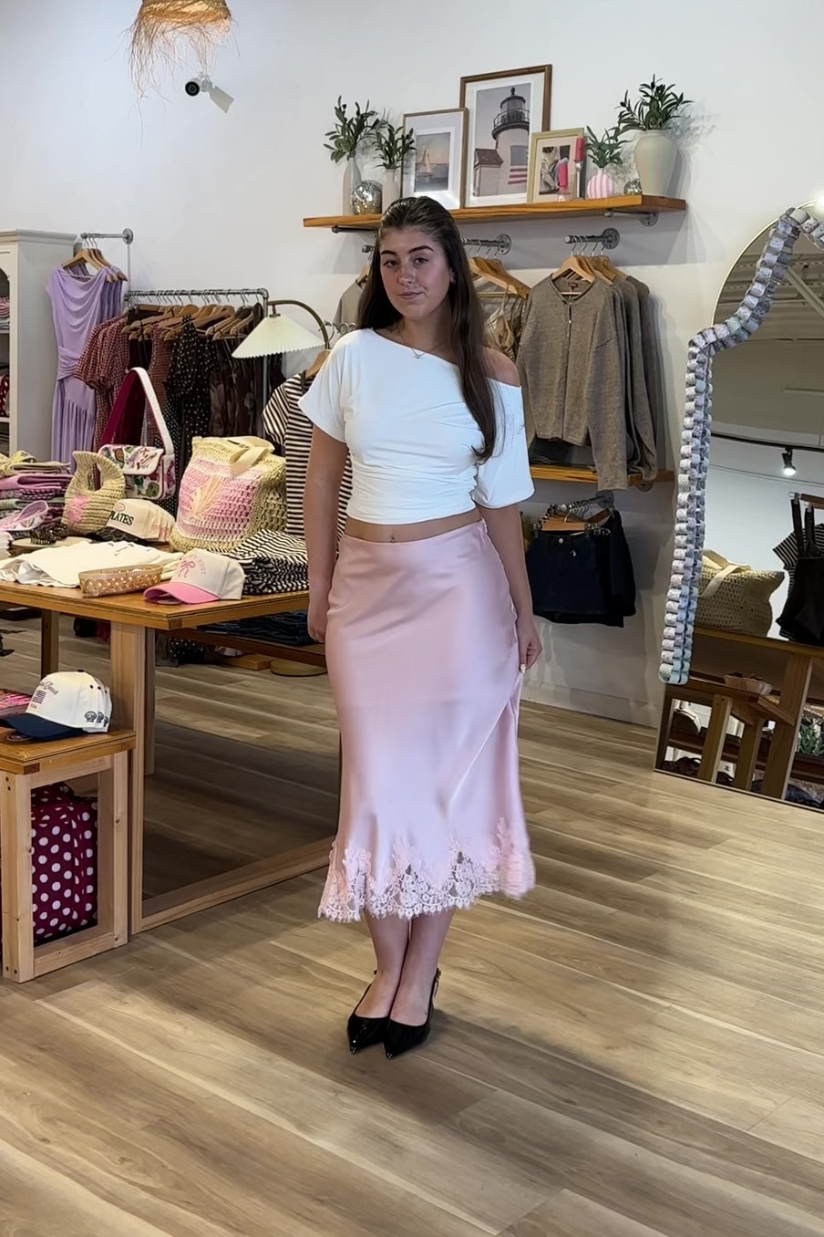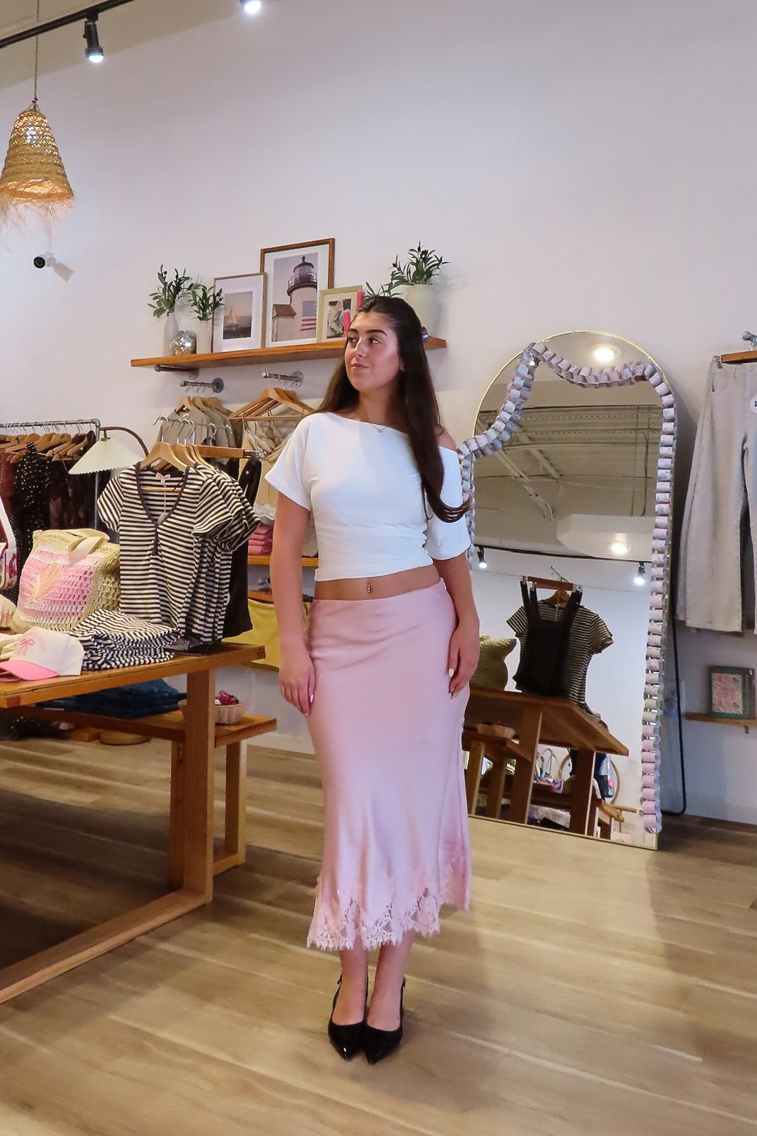 Pink, satin midi skirt with bias cut, lace hem, and side zipper