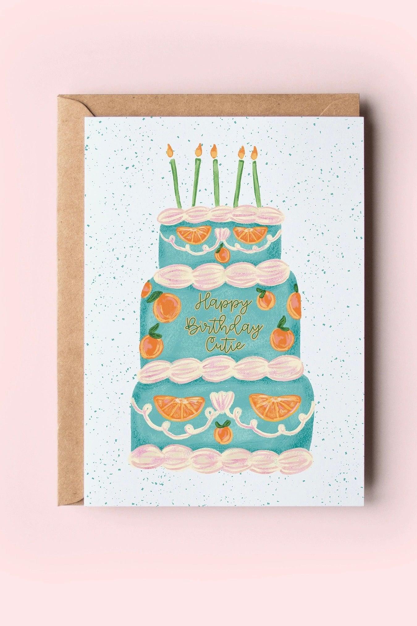 A7 greeting card with birthday cake and oranges original artwork by artist