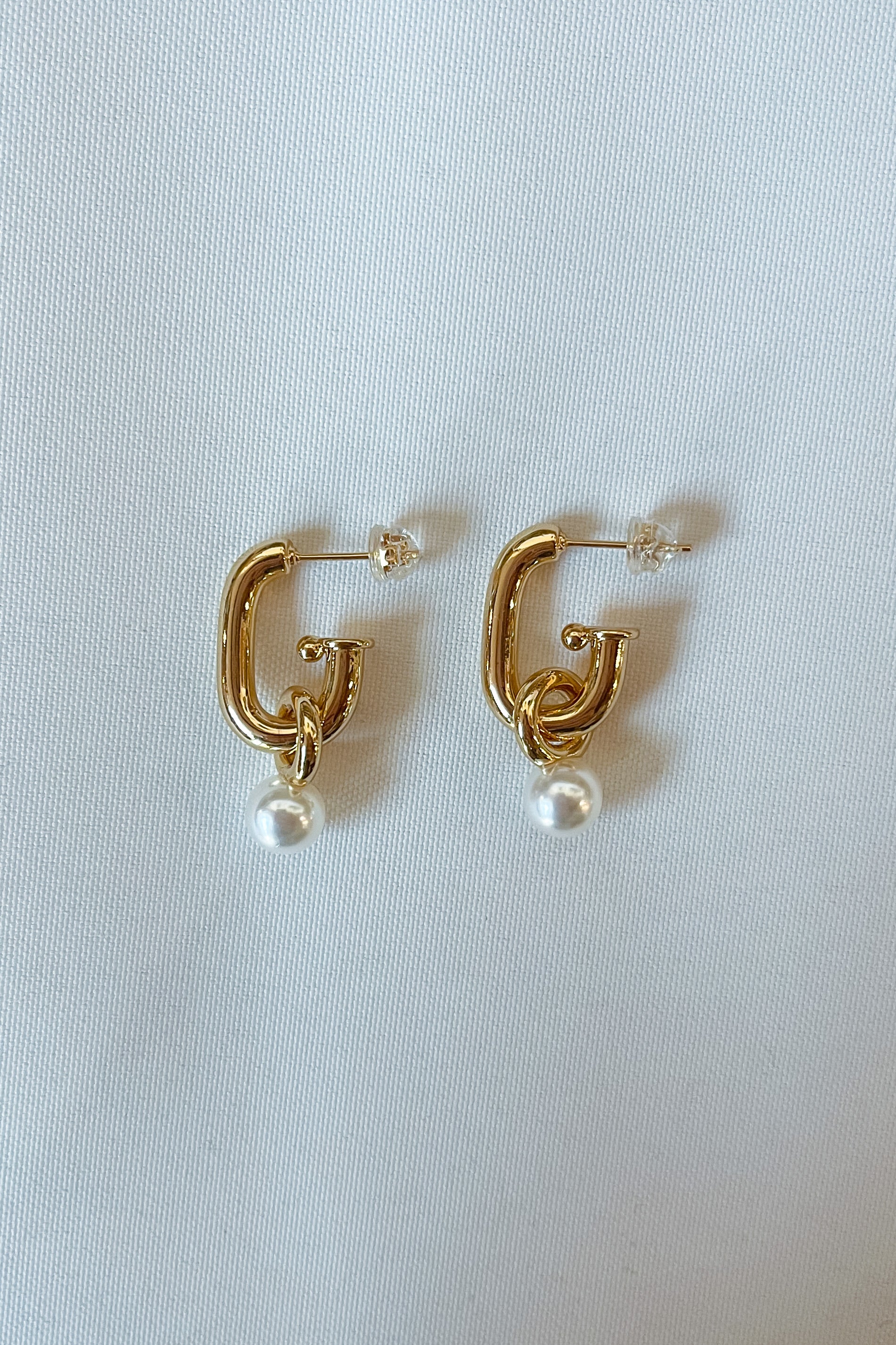 24K Gold filled, boxy J-shaped pearl drop hoop earrings