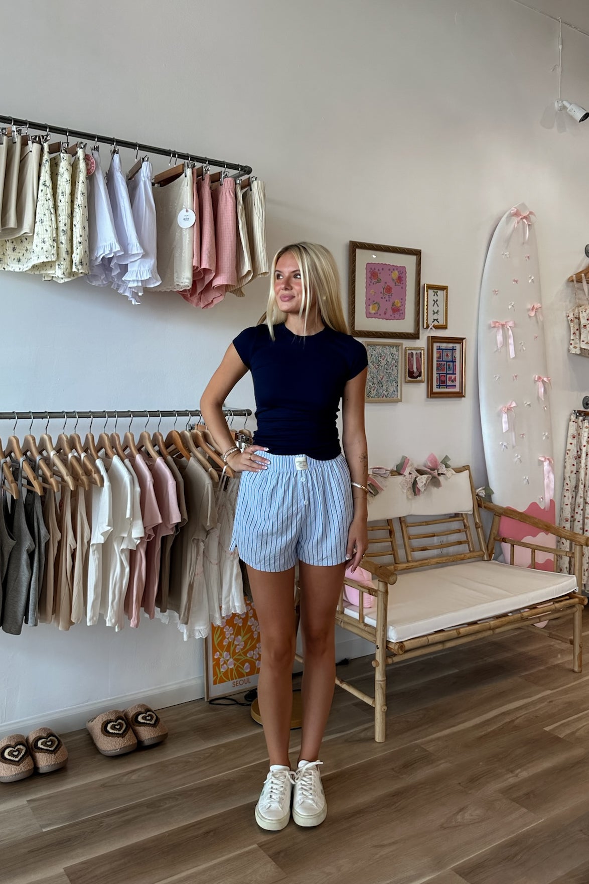 Blue, ribbed top with cap sleeves, fitted body, and crew neck