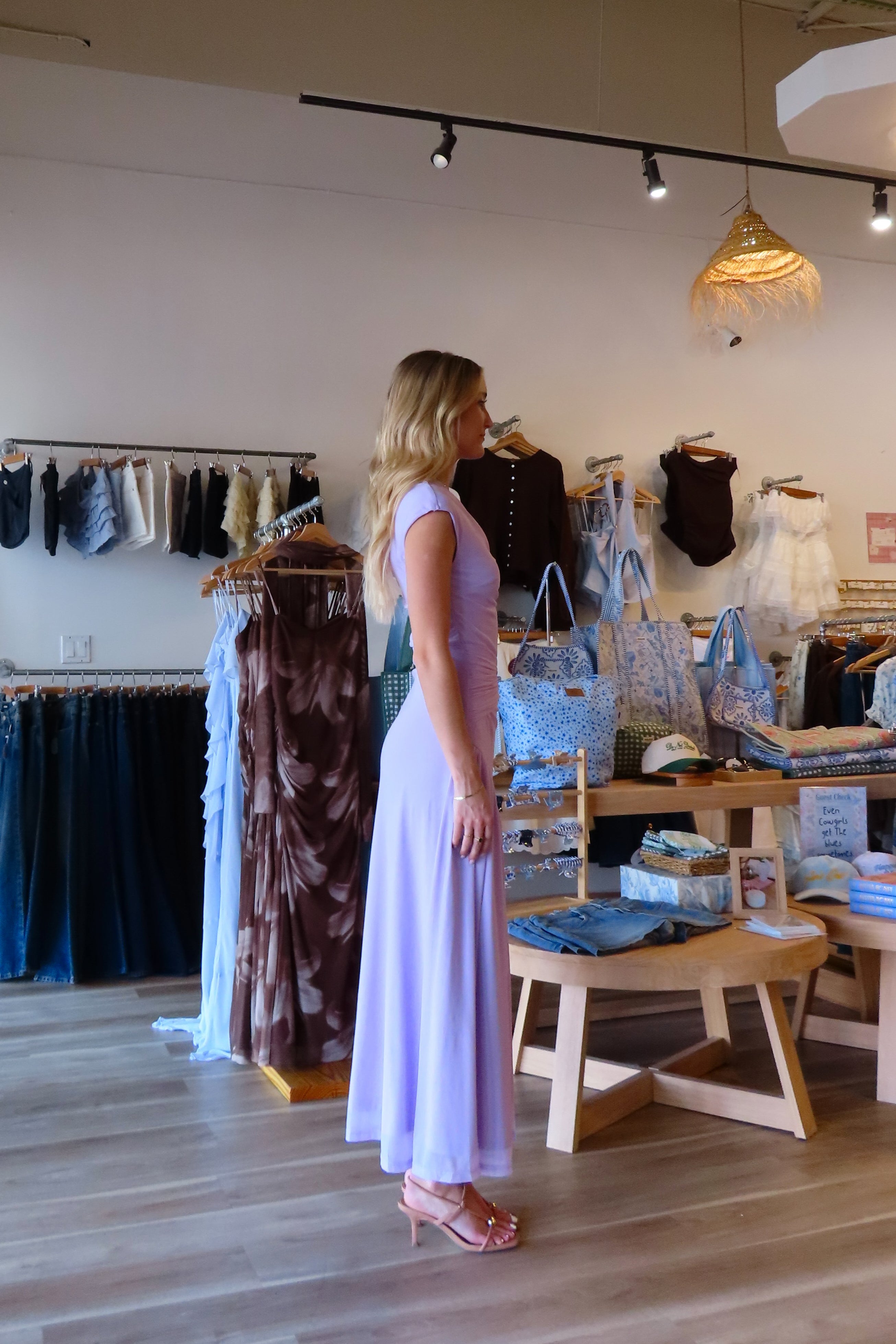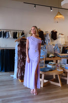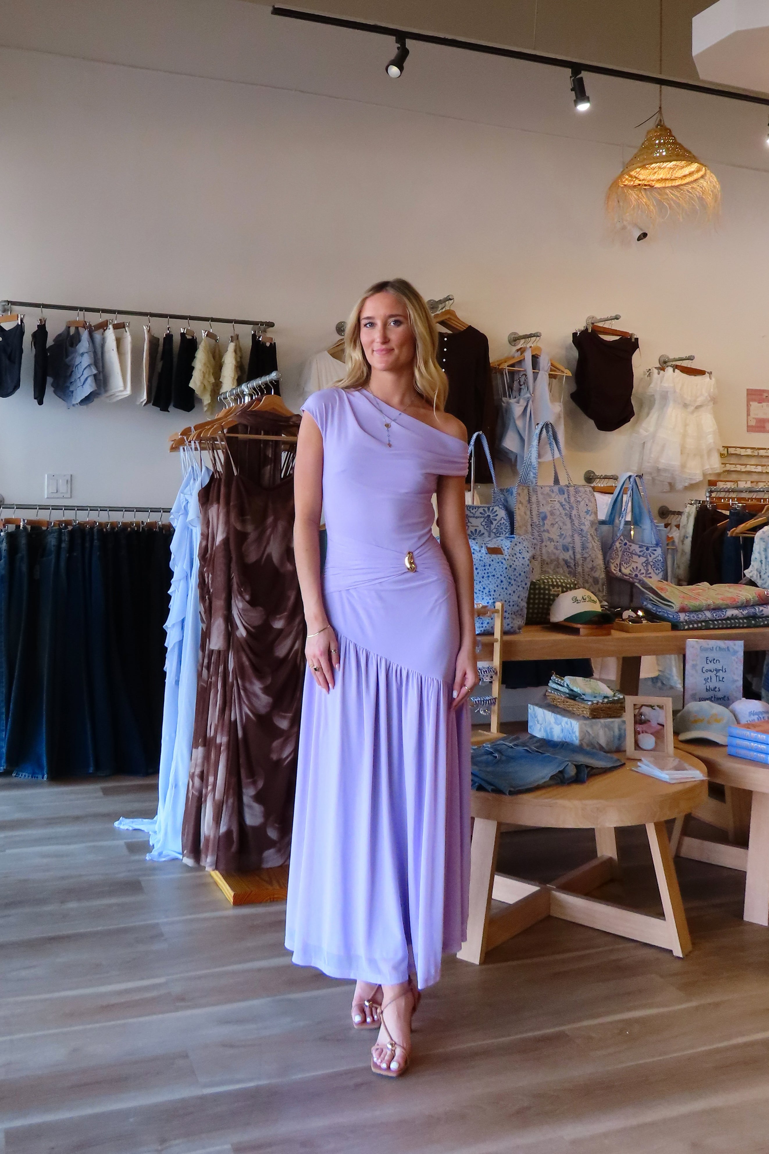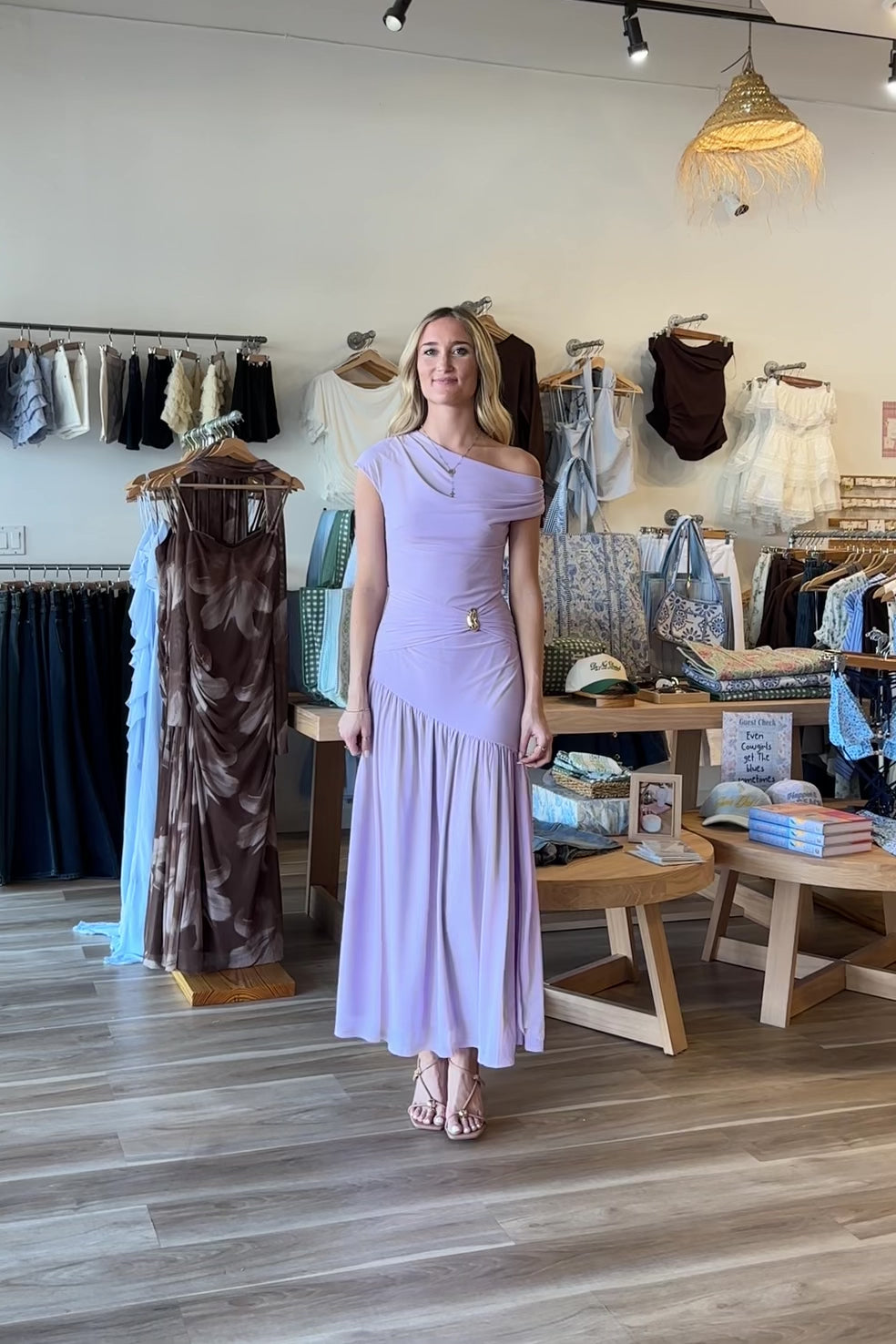 Purple, off shoulder maxi dress with gold accent on waist, ruched sides, asymmetrical waist, and mesh layered skirt