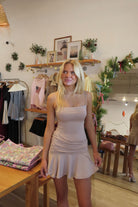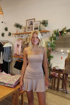 Tan, mini dress with drop waist, ruched bodice, ruffled hem, adjustable straps, and side zipper