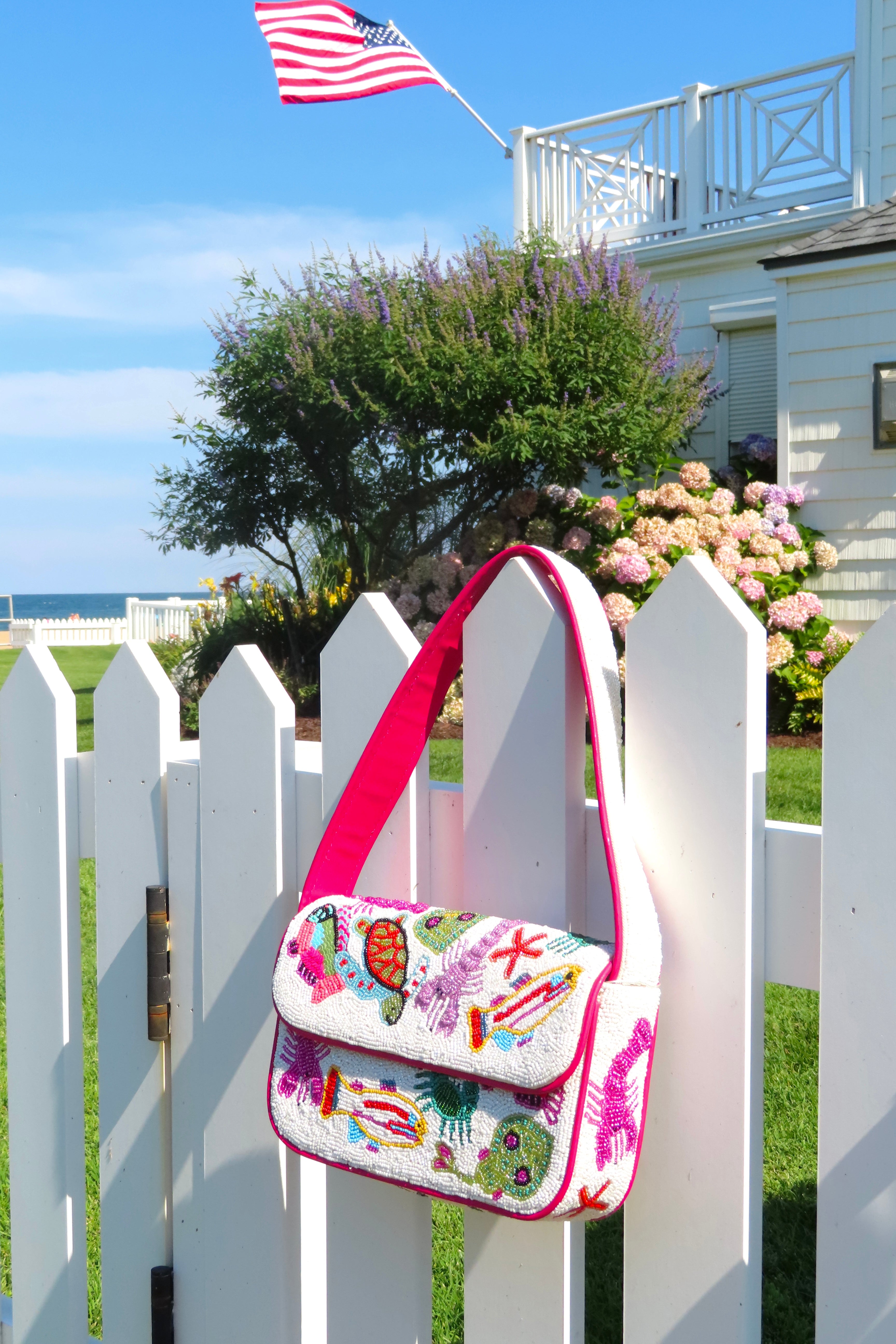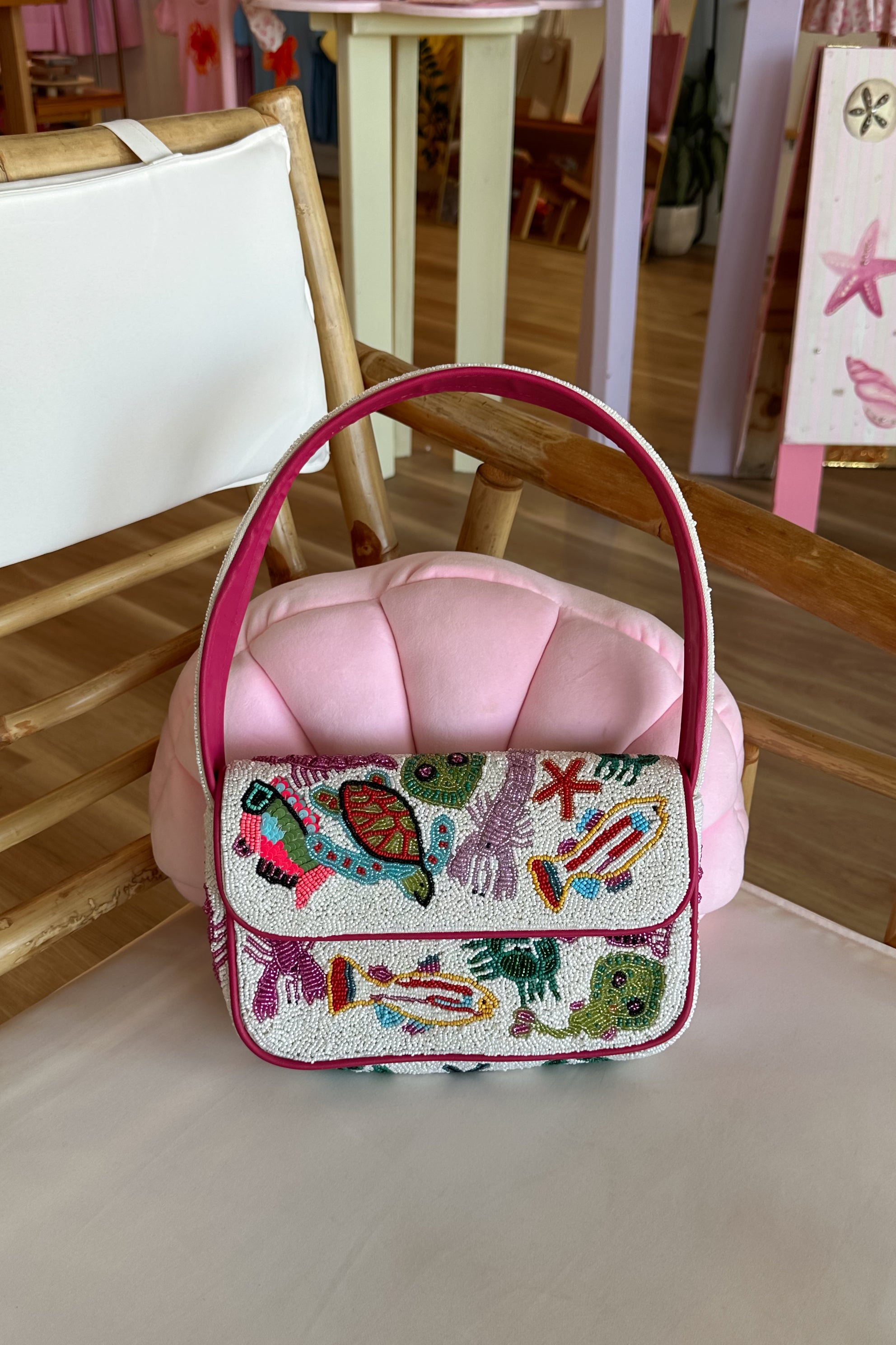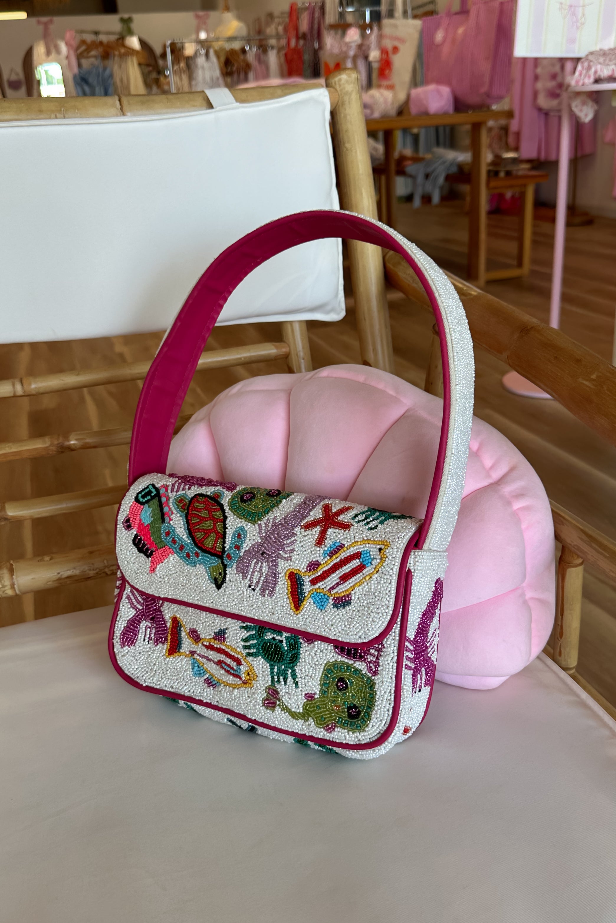Structured shoulder bag with ocean-life embellishments, magnetic button flap closure, and interior and back pockets