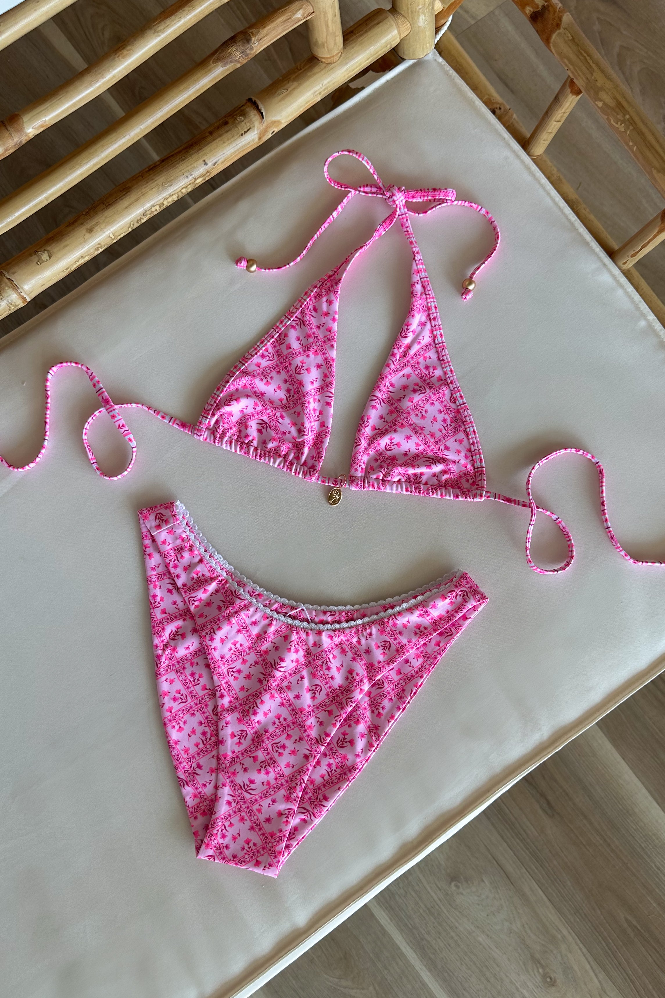 Kulani Kinis, full coverage bottom with decorative trim and low rise cut, wear higher on your hips to create more of a 'Y' shape figure.