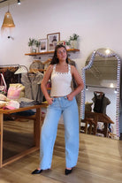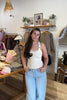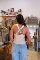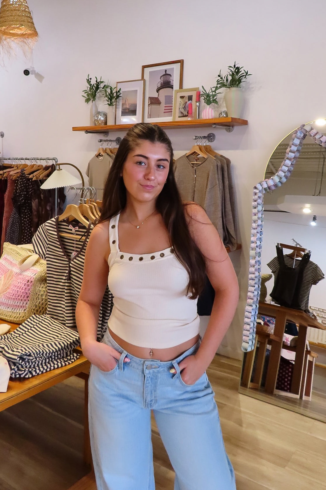 Cream, ribbed tank top with square neckline, grommet trim, and cross back straps