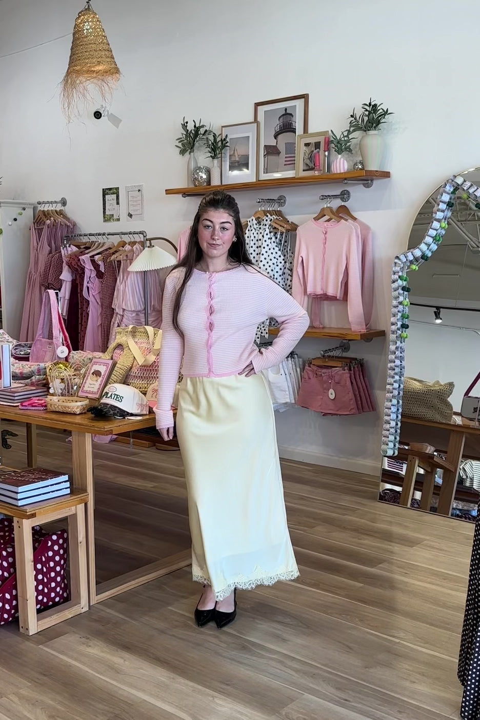 Yellow, satin midi skirt with elastic waist, lace trim, and lining