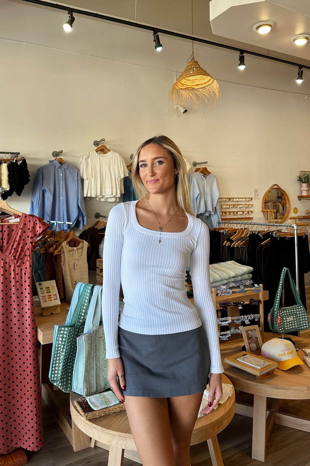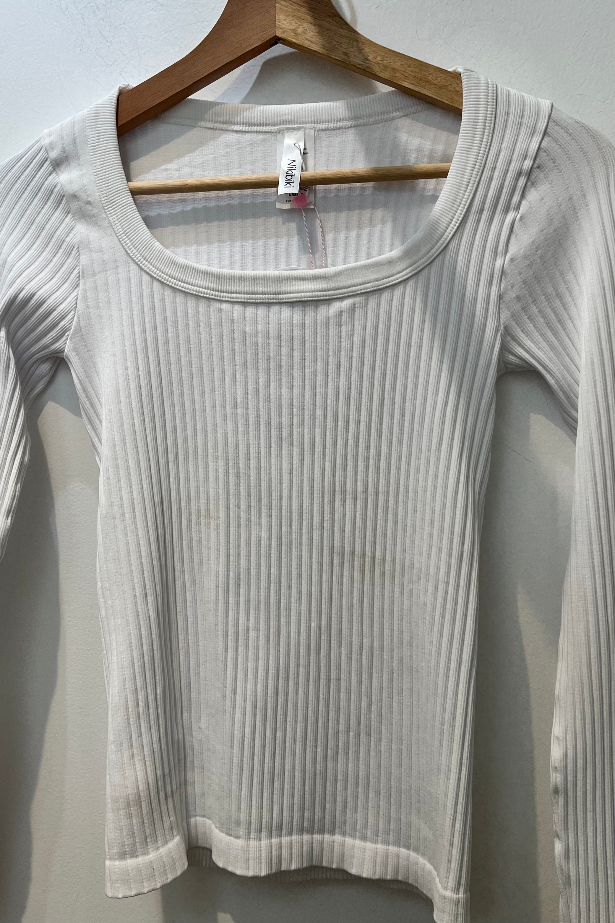Ribbed long sleeve top with a square neckline.