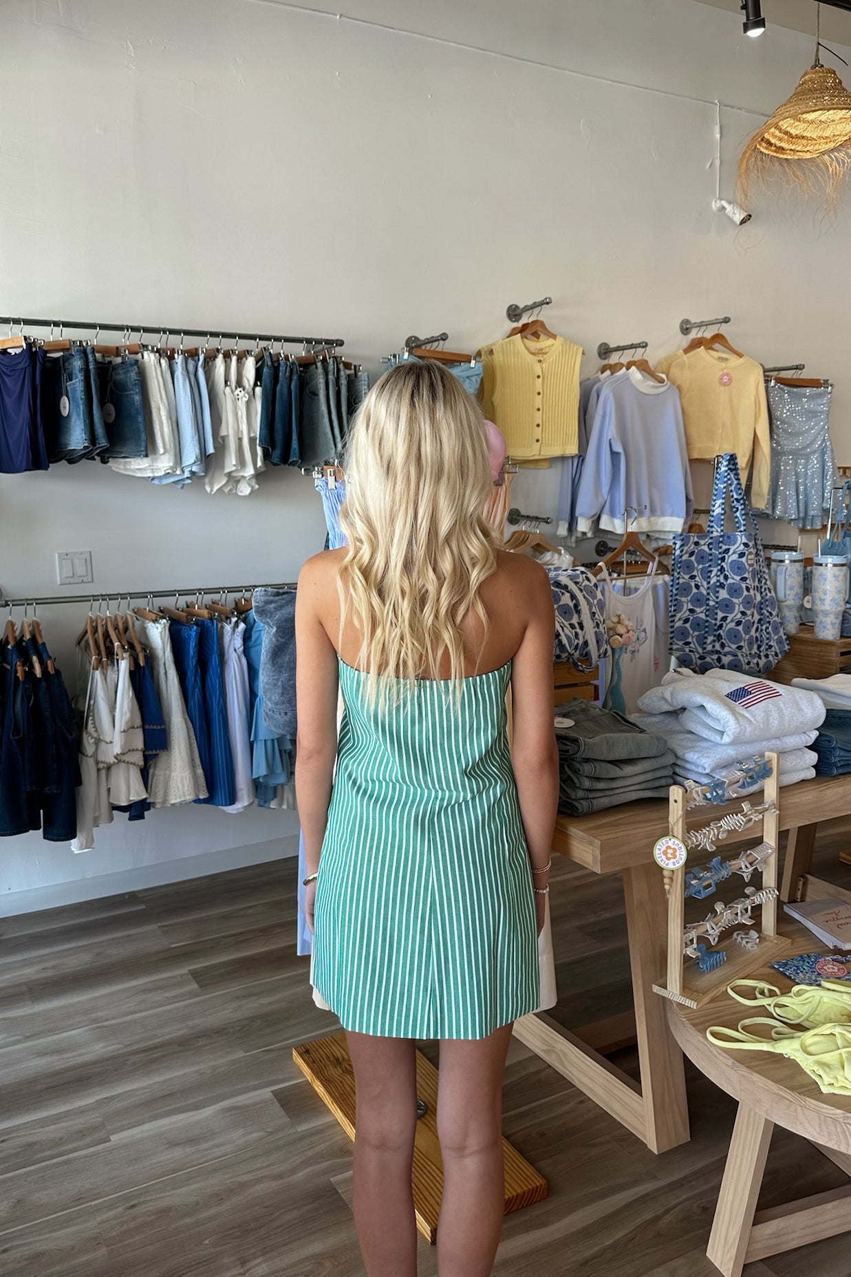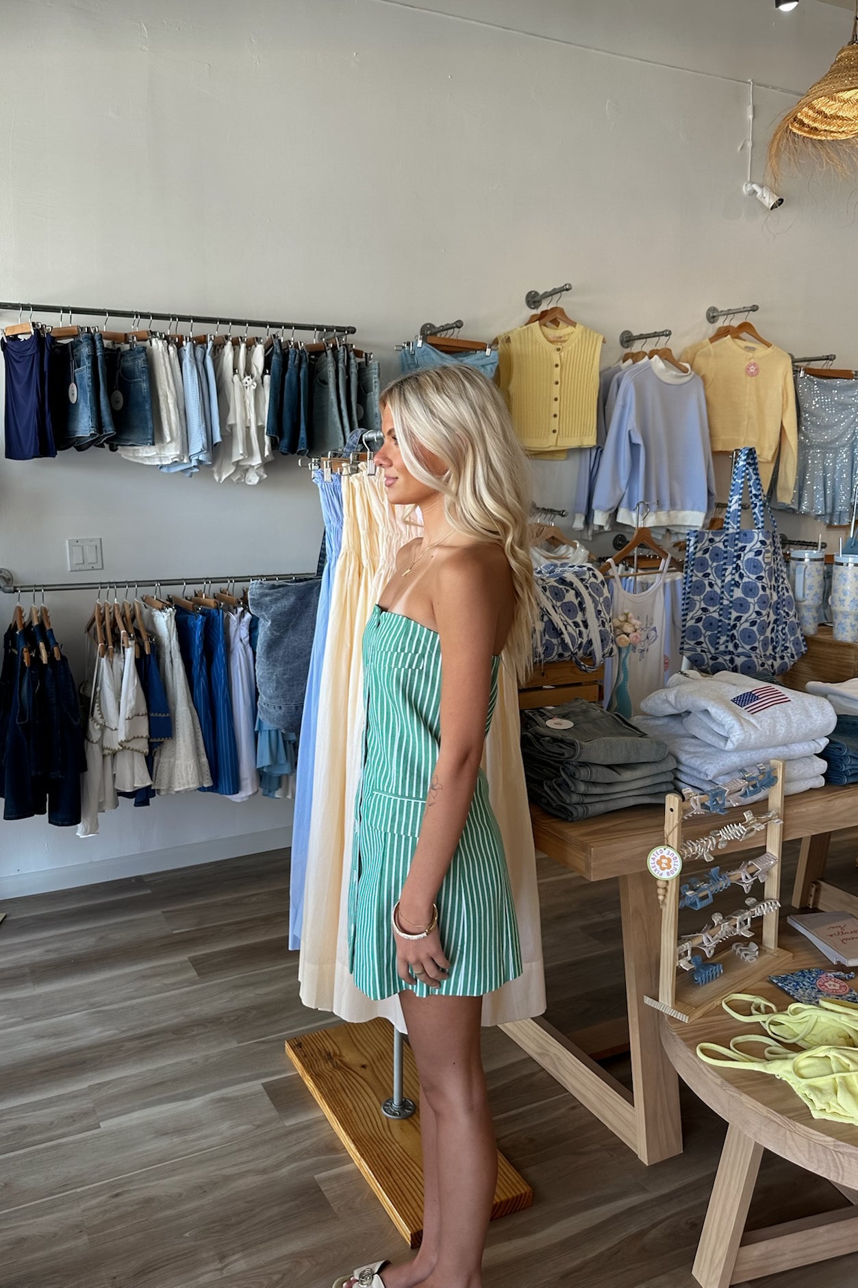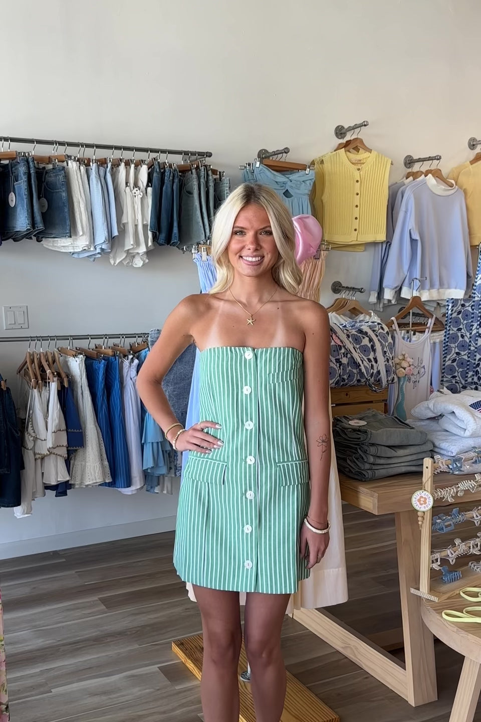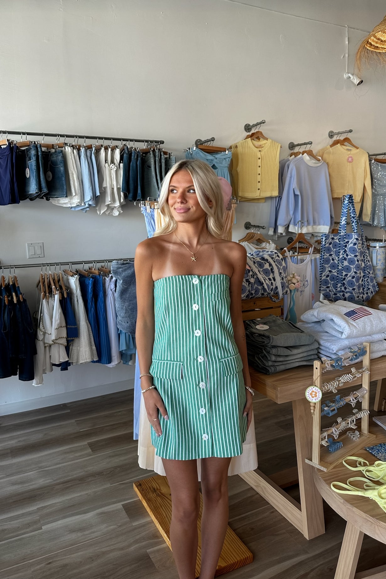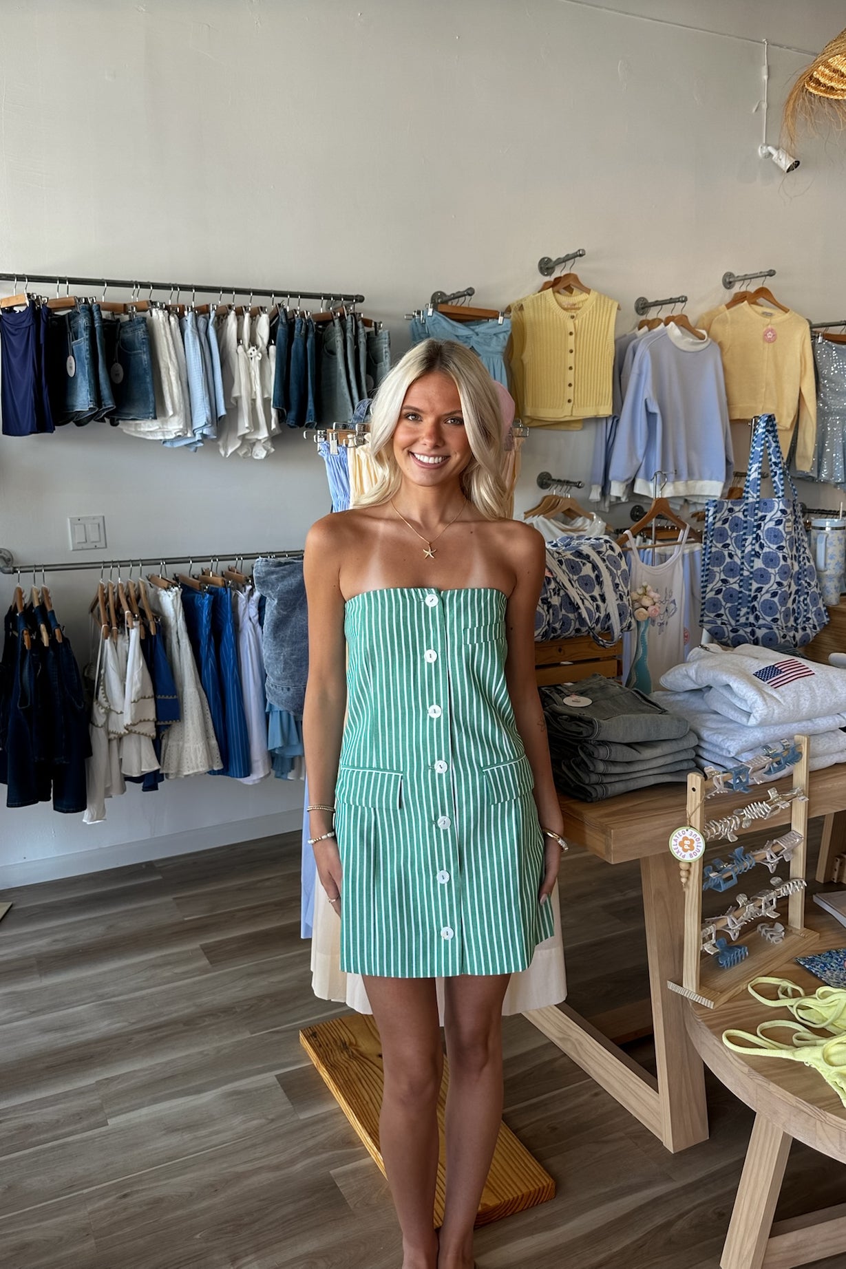 Green, striped strapless mini dress with buttons and pocket flaps