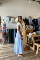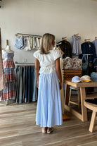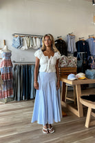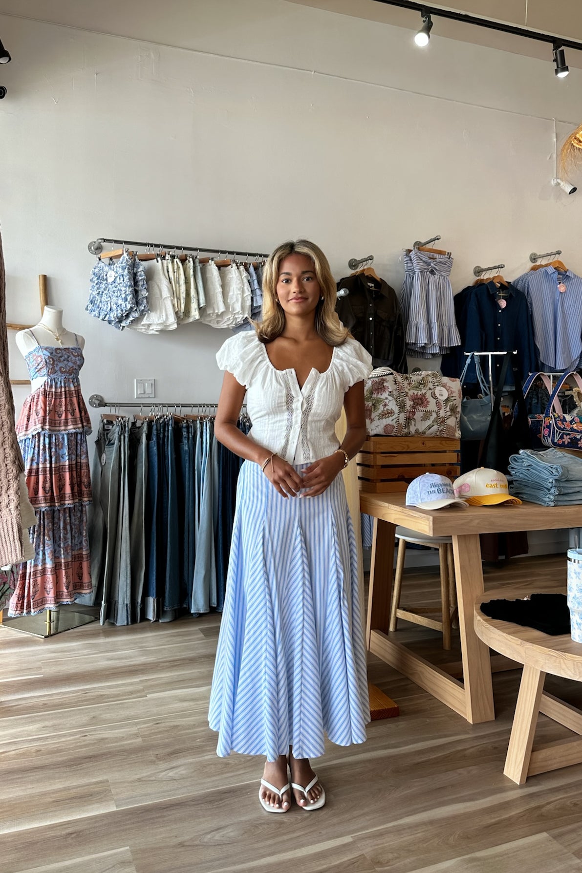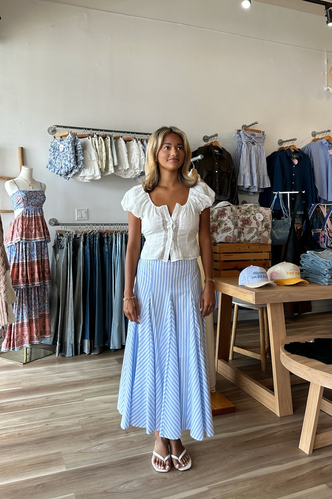 Blue, striped midi skirt with flared hem, elastic back waist band, and lining