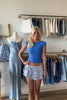 Blue, striped low rise mini skirt with ruffled tiers and elastic waistband
