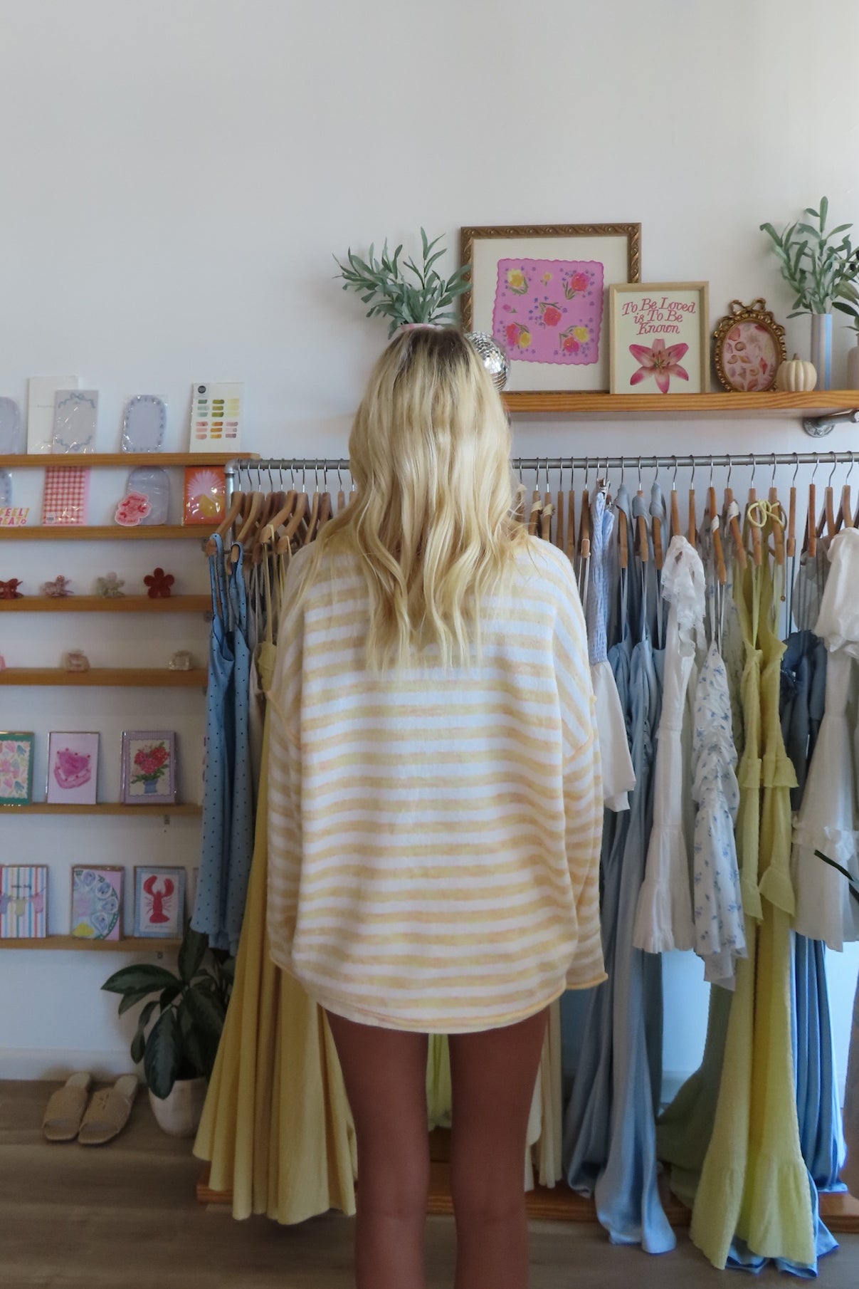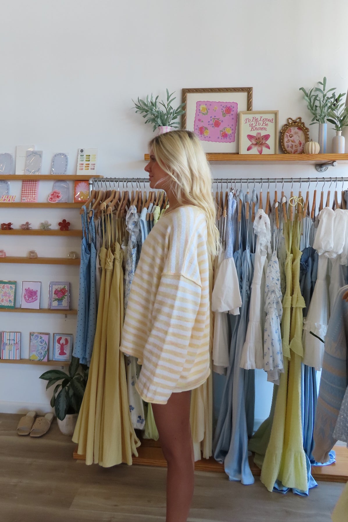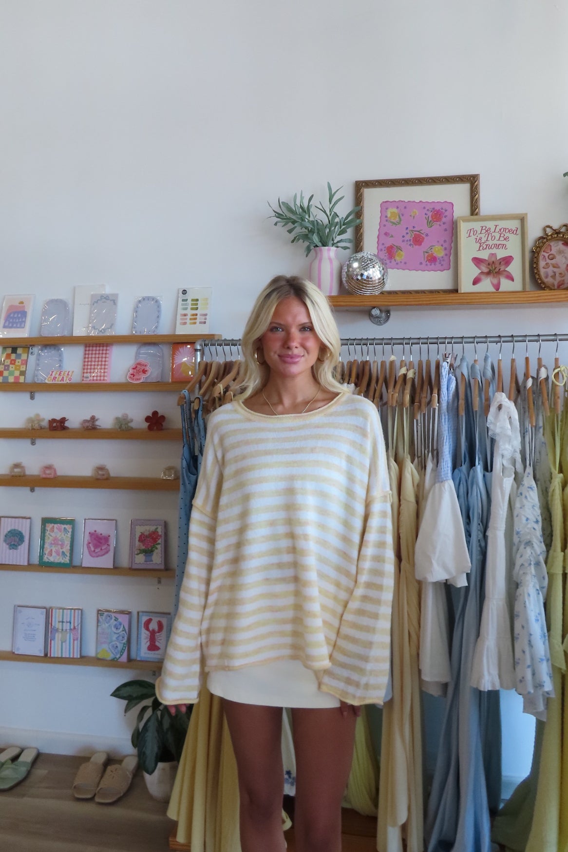 Yellow, striped sweater with round neckline and bell sleeves