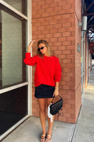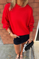 Red, oversized sweater with ribbed hems, balloon sleeve, and mock neck