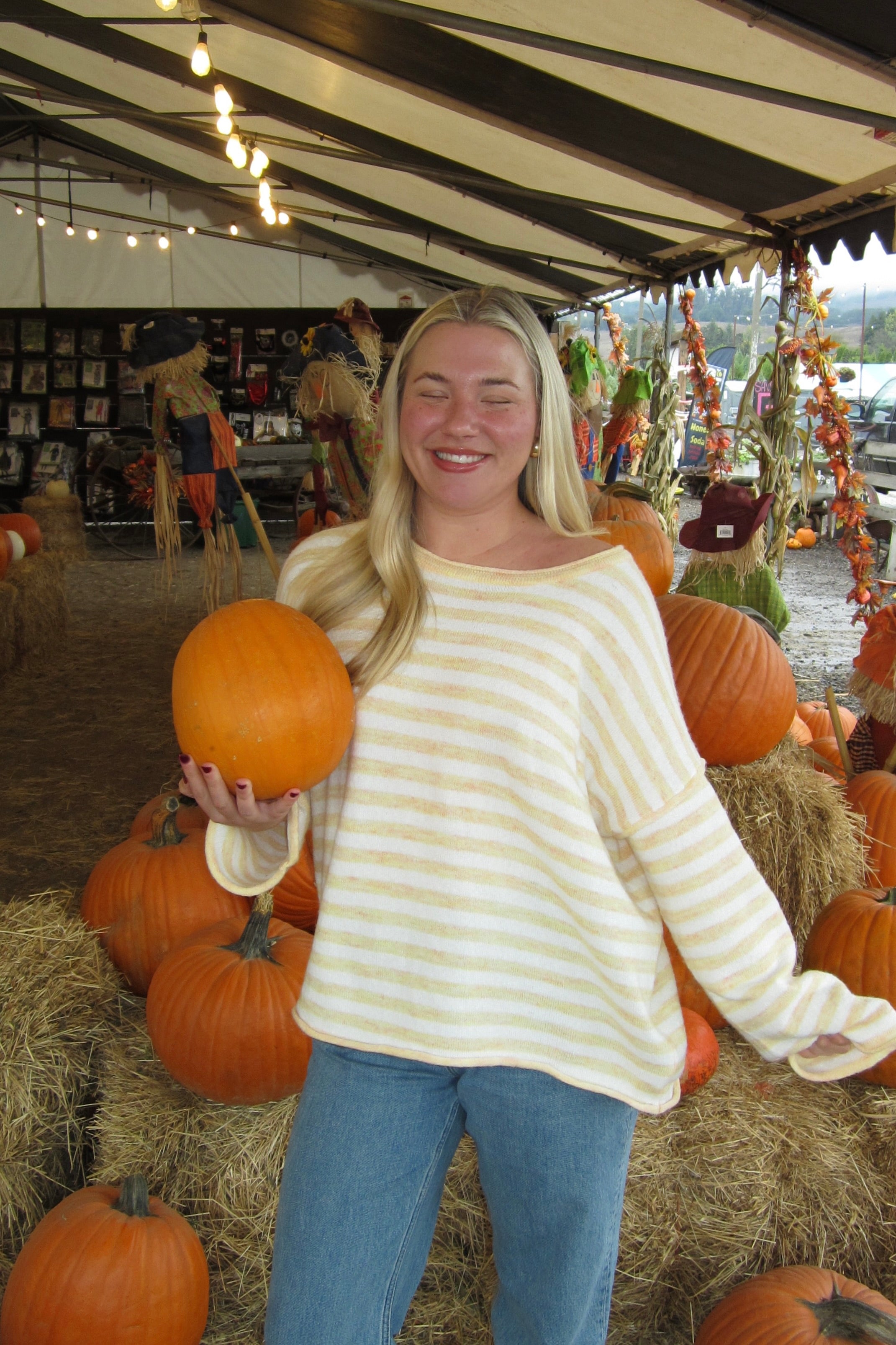 Yellow, striped sweater with round neckline and bell sleeves