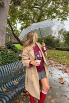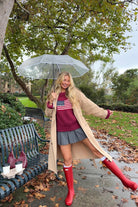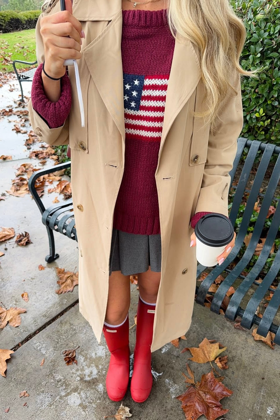 Red, American flag sweater with boat neckline, ribbed hem, and oversized fit
