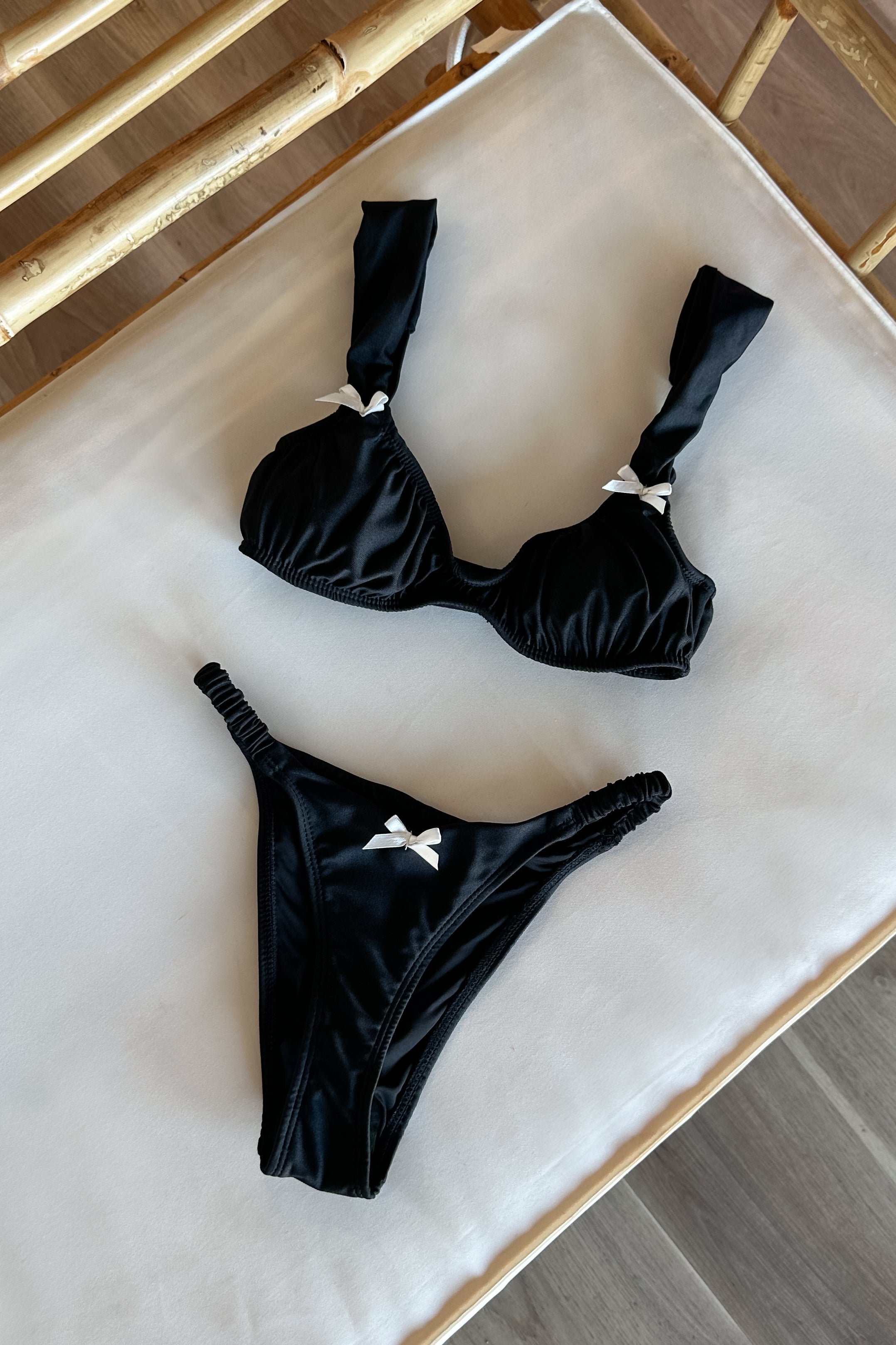 Dippin' Daisy's, scoop neckline bikini top with draped fabric, wide straps, and mini bows