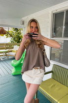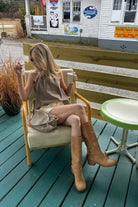 Brown, halter top with high neckline, pleating, high-low hem, and open back