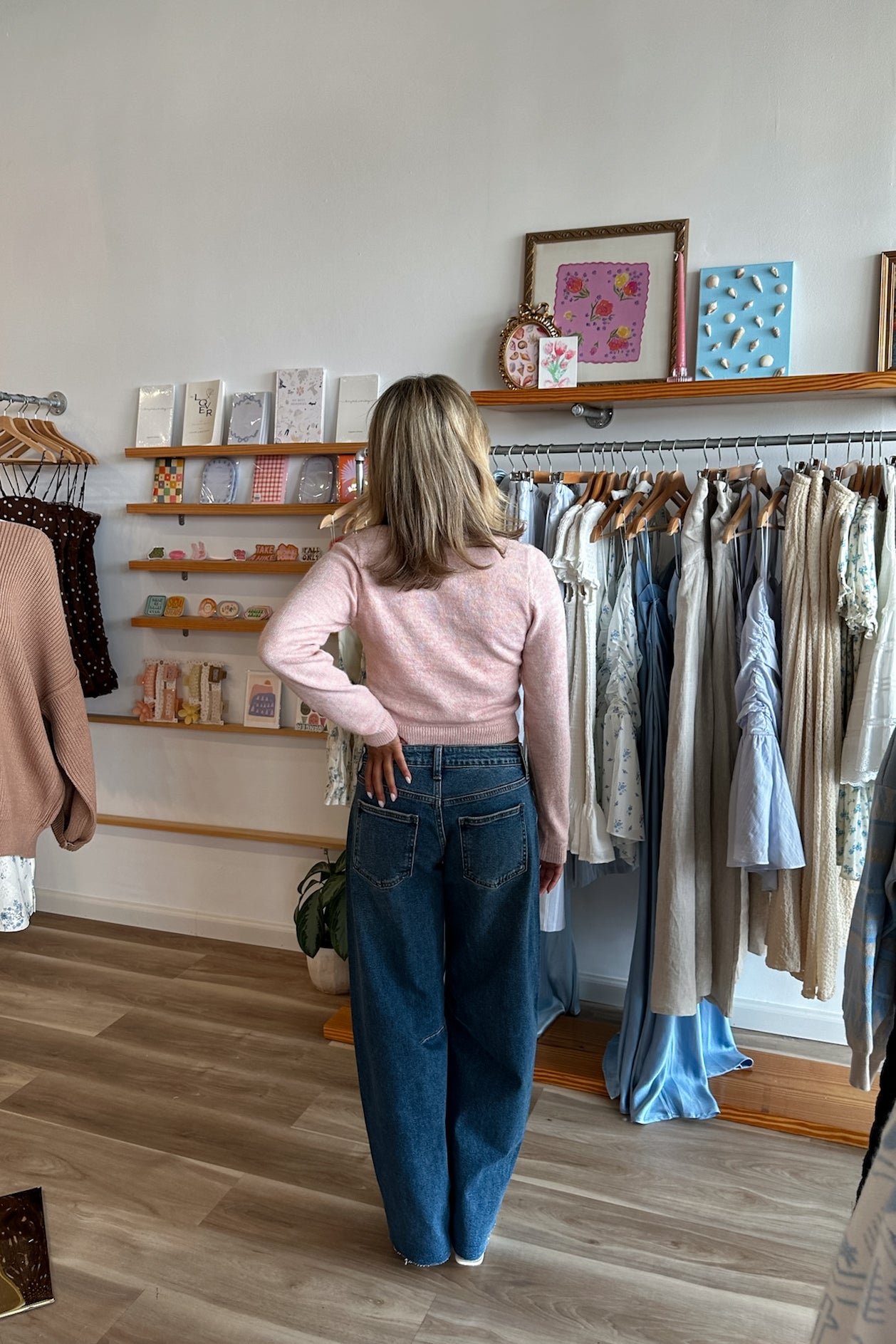 Pink, knit top with round neckline, long sleeves, hole point, and cropped length
