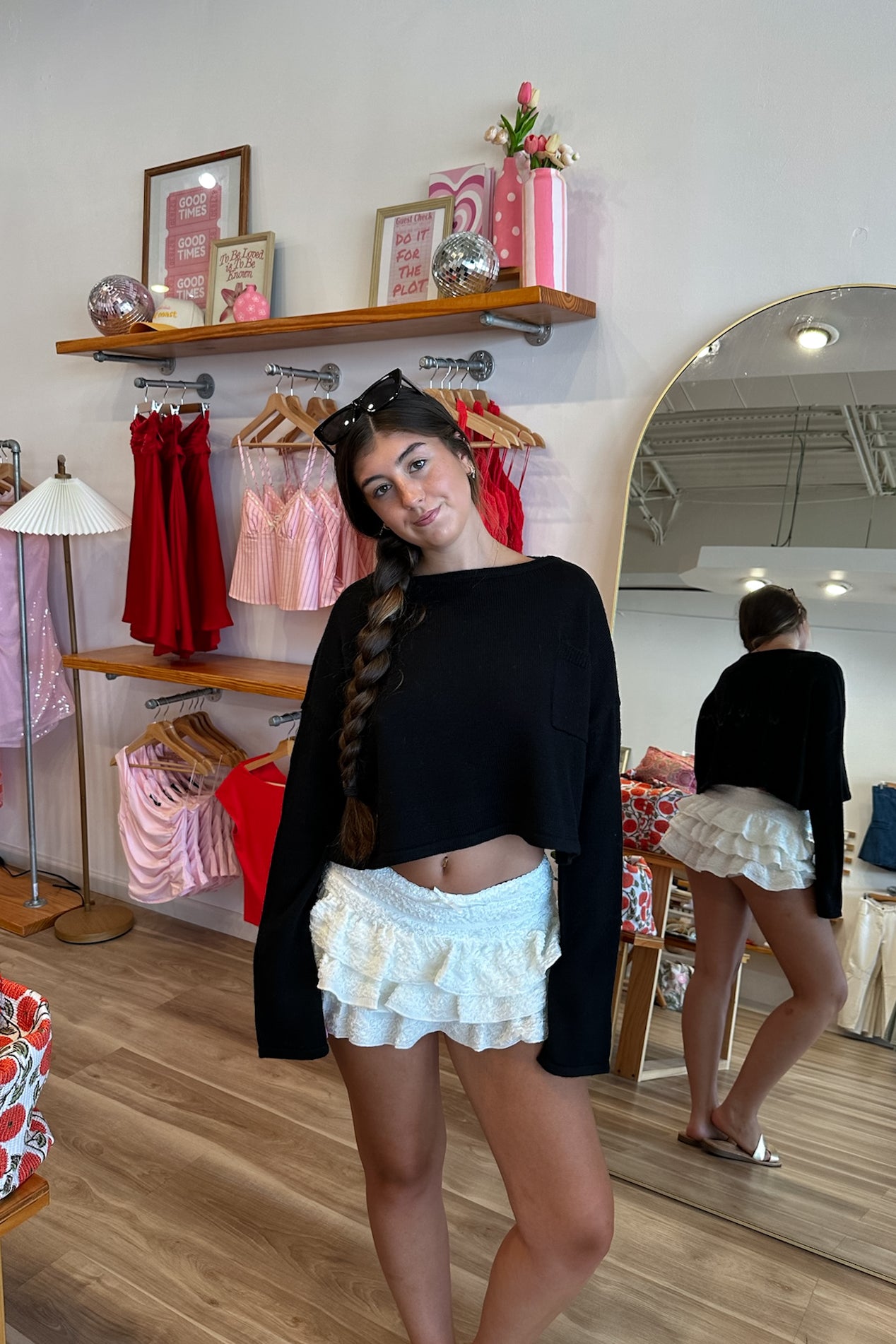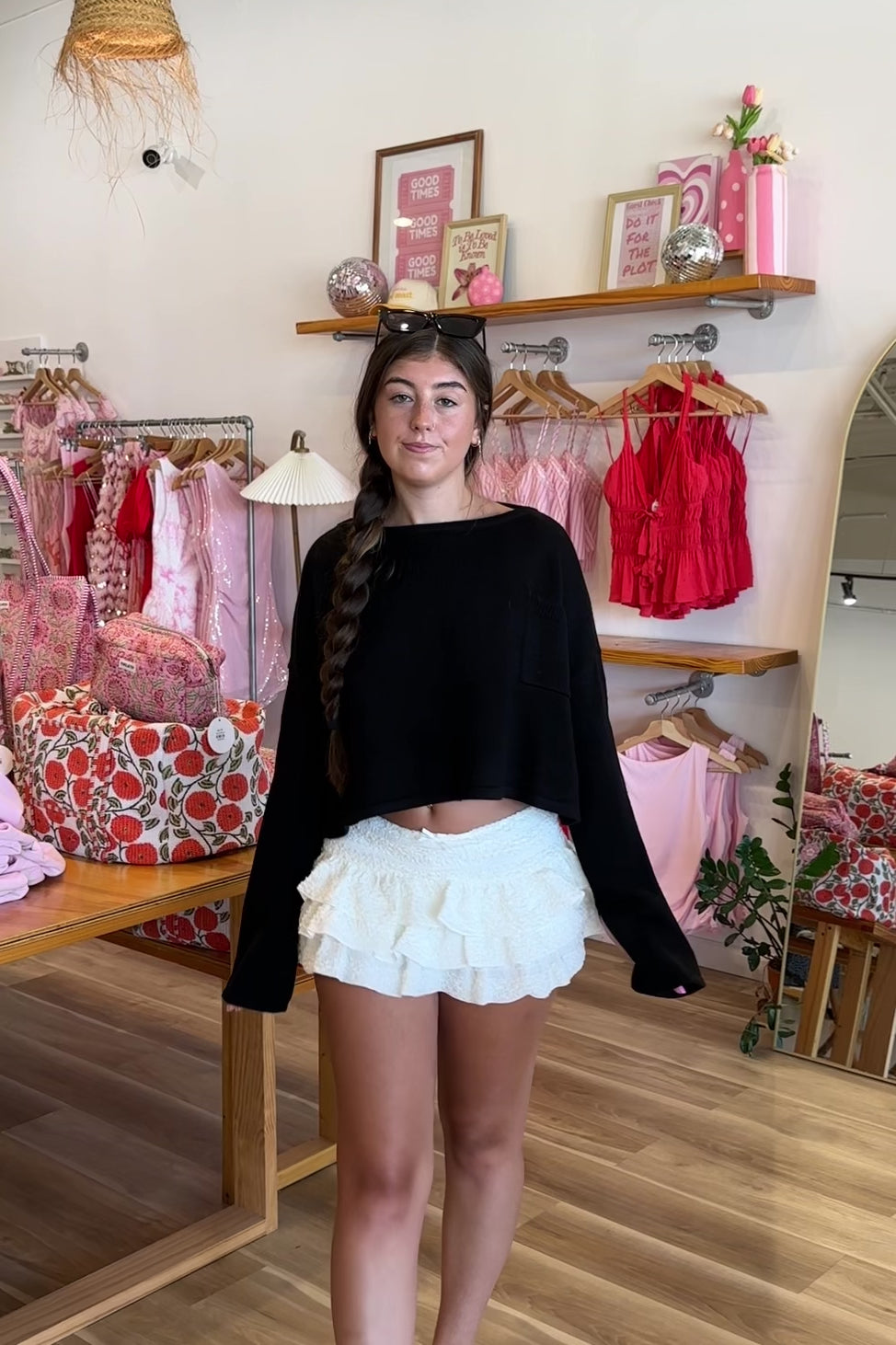 Black, knit sweater with drop shoulder, front pocket, slit sleeves, and cropped length
