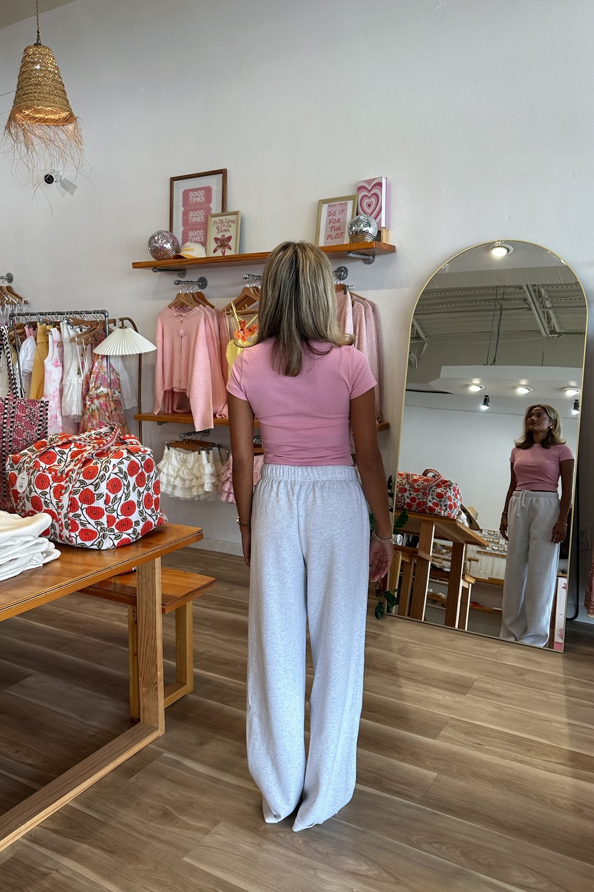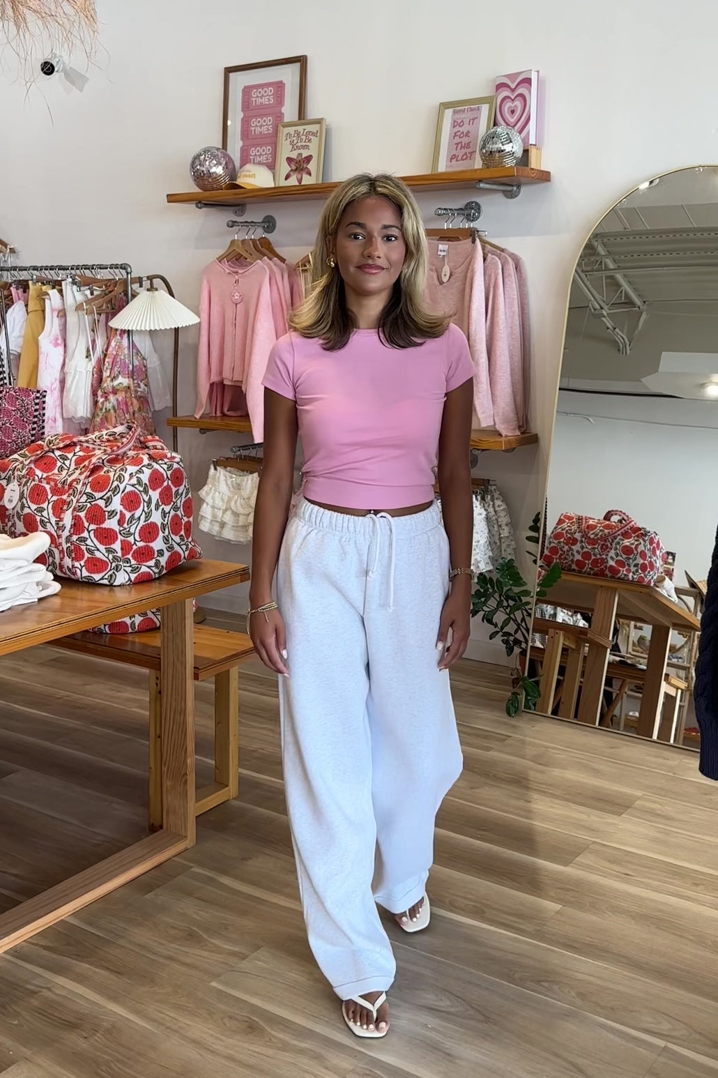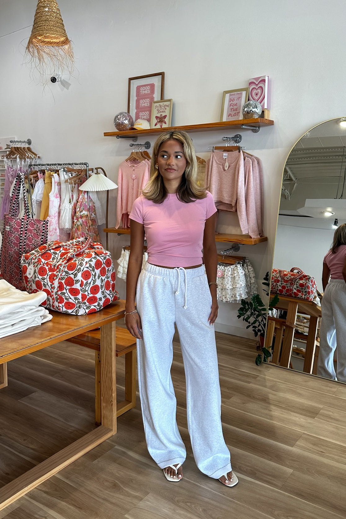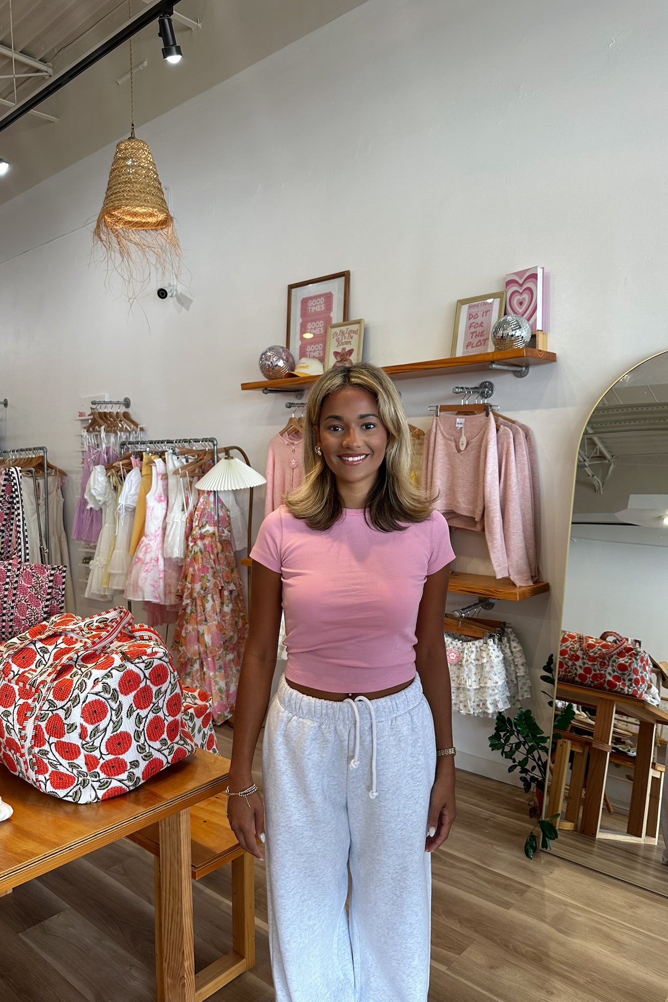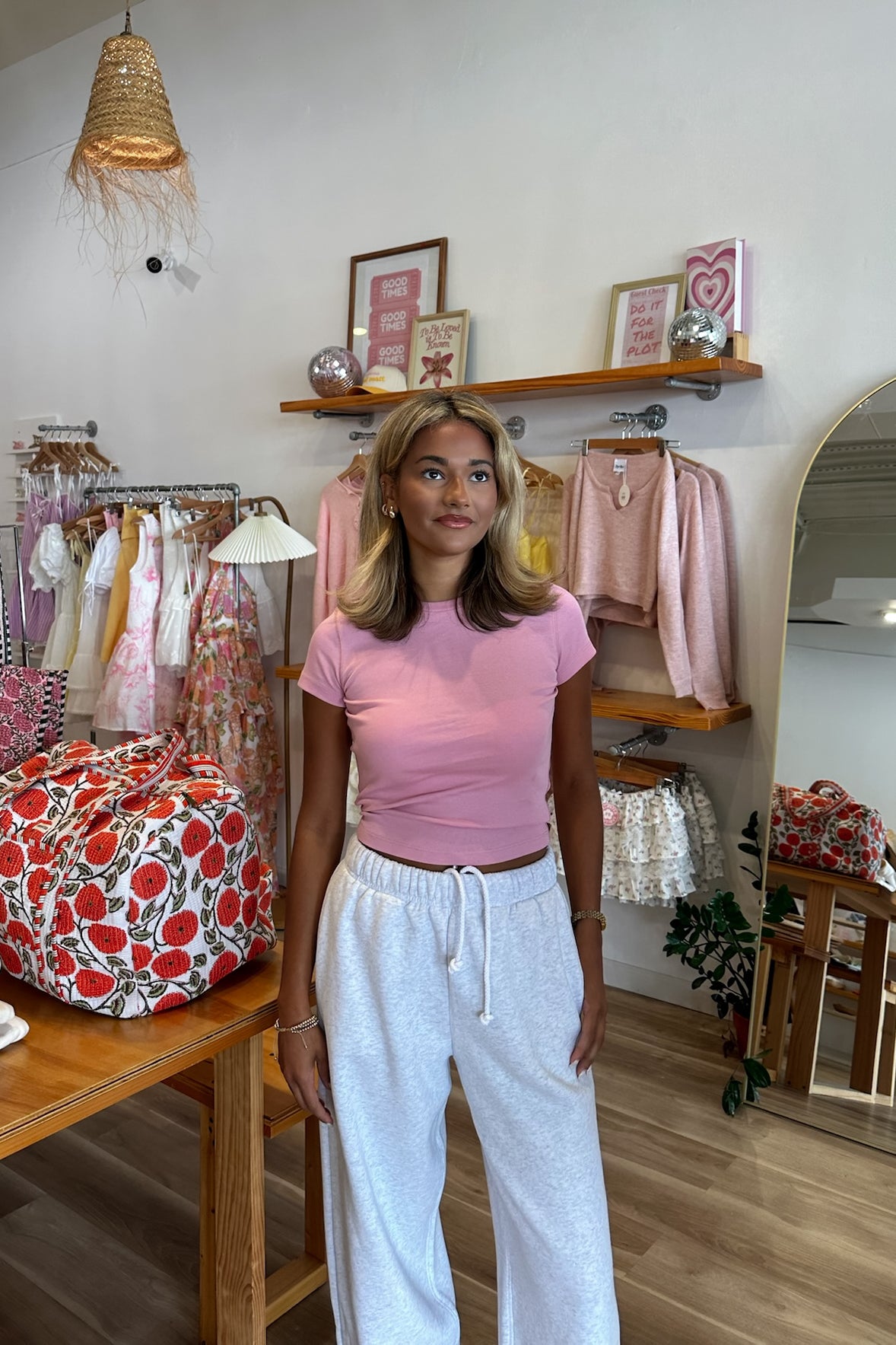 Pink, cotton blend baby tee with crew neckline and hem stitching