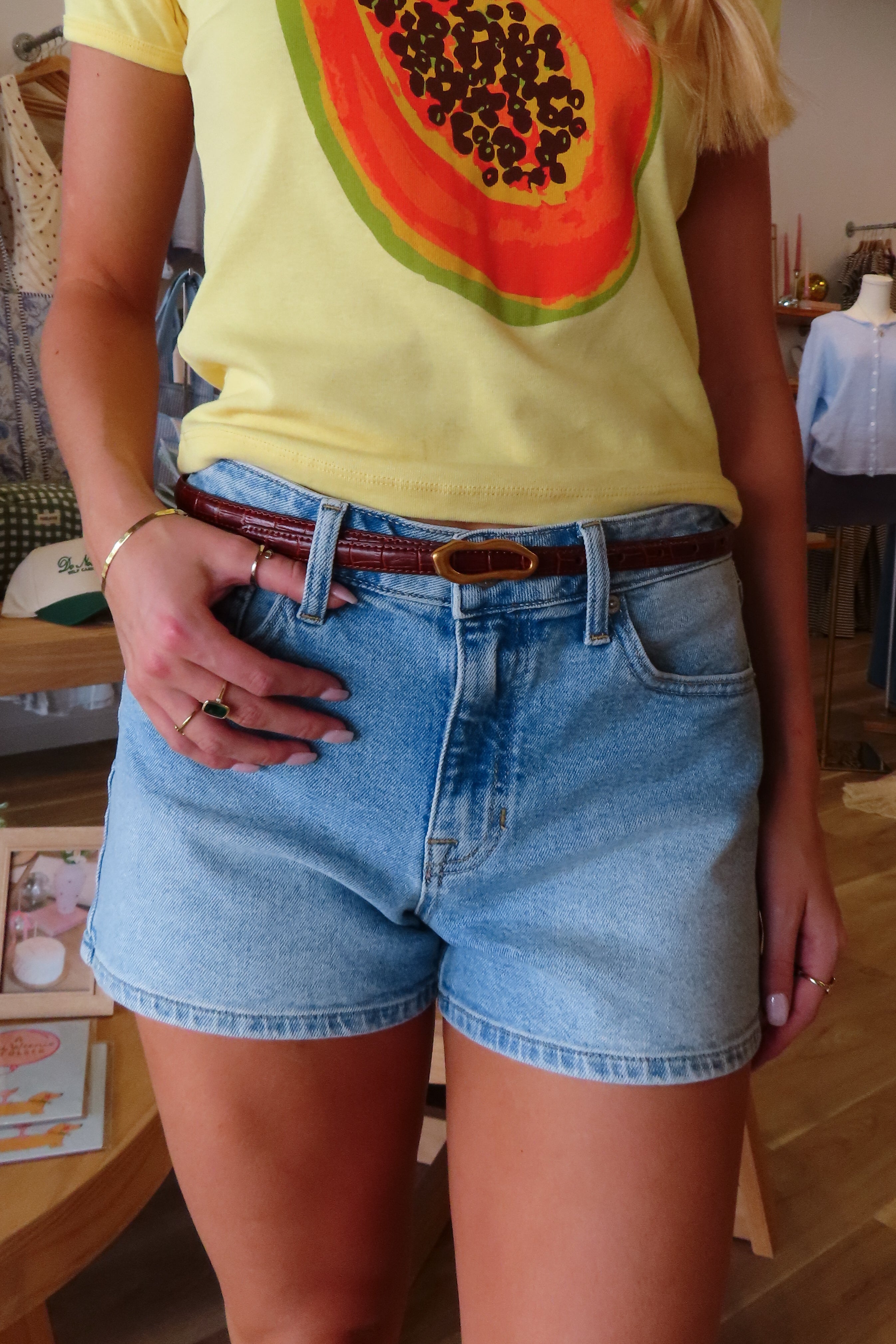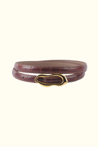 Thin crocodile leather belt with asymmetrical buckle. Crafted from high-quality crocodile-embossed leather.