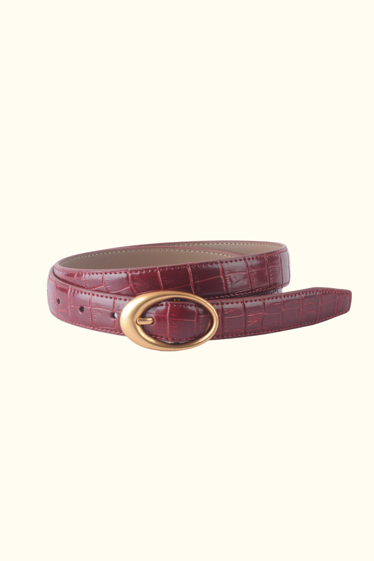 Crocodile leather belt with oval buckle and clean stitched edges. Crafted from crocodile-embossed leather.