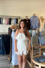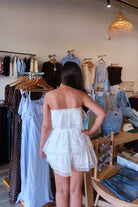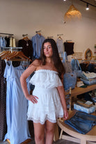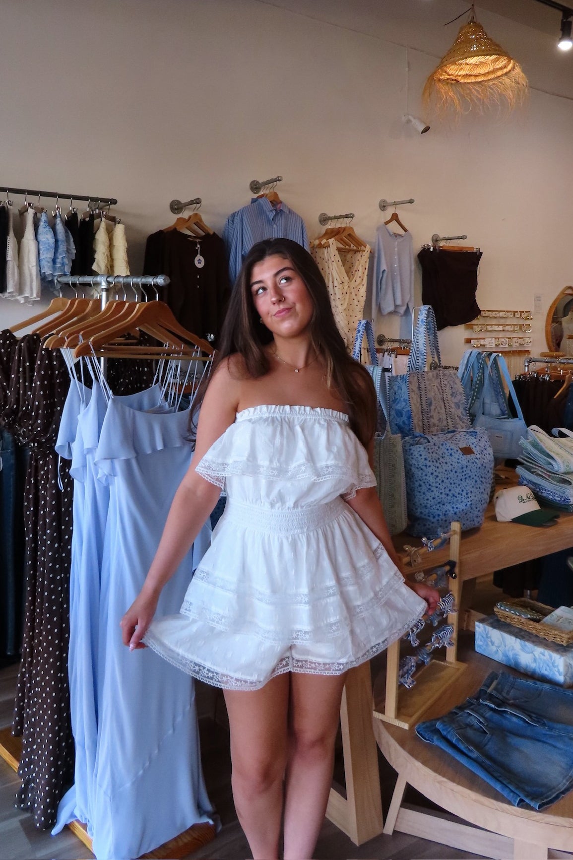 White, ruffle tiered romper with smocked waist, lace trim, and lining
