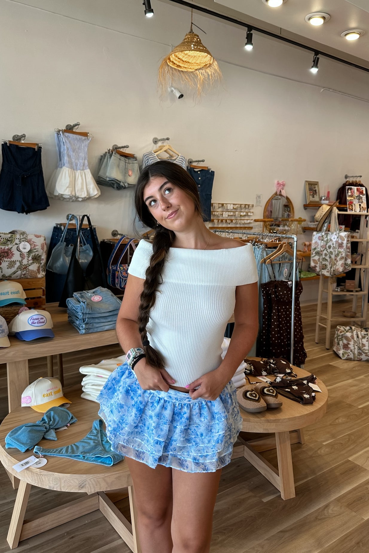 White, off shoulder top with ribbed fabric and fold over neckline