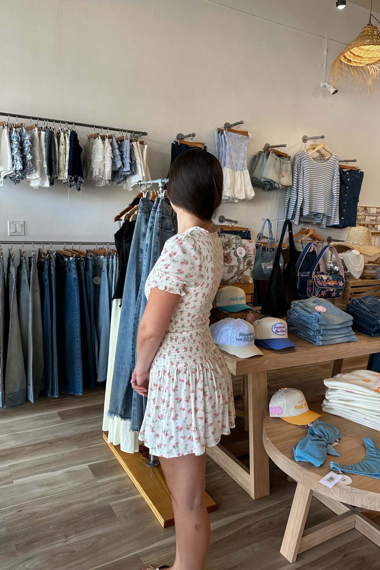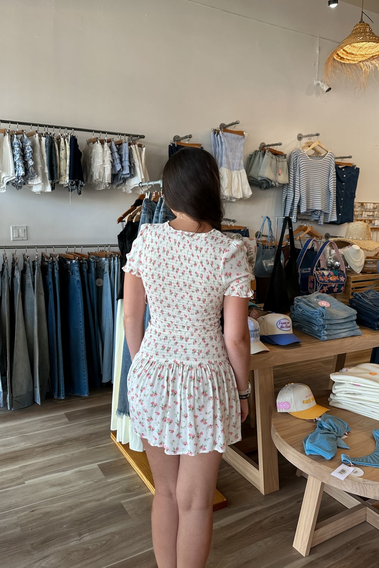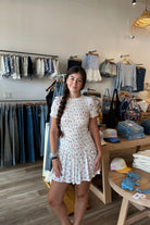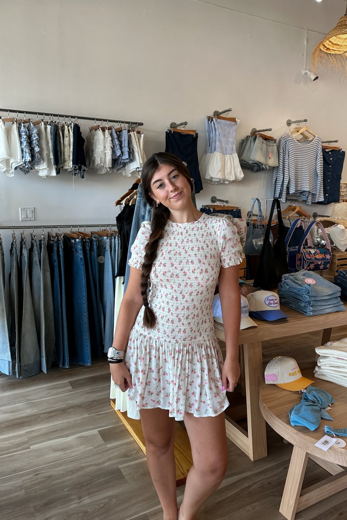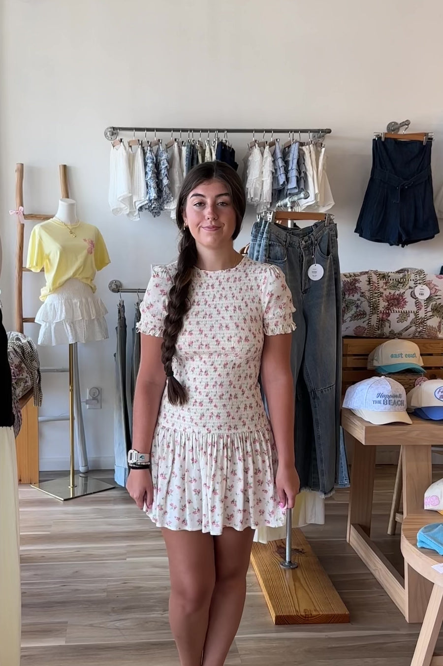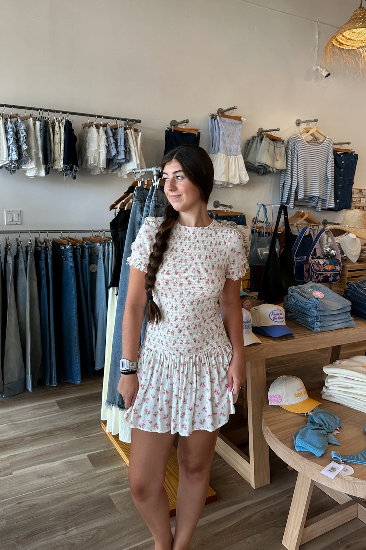 Pink, plaid mini dress with crew neckline, puff sleeves, smocked bodice, and drop waist