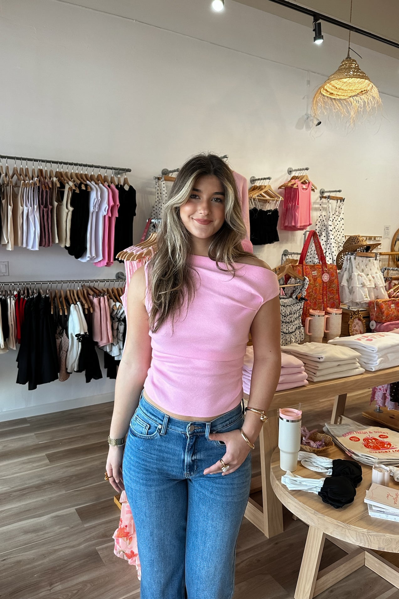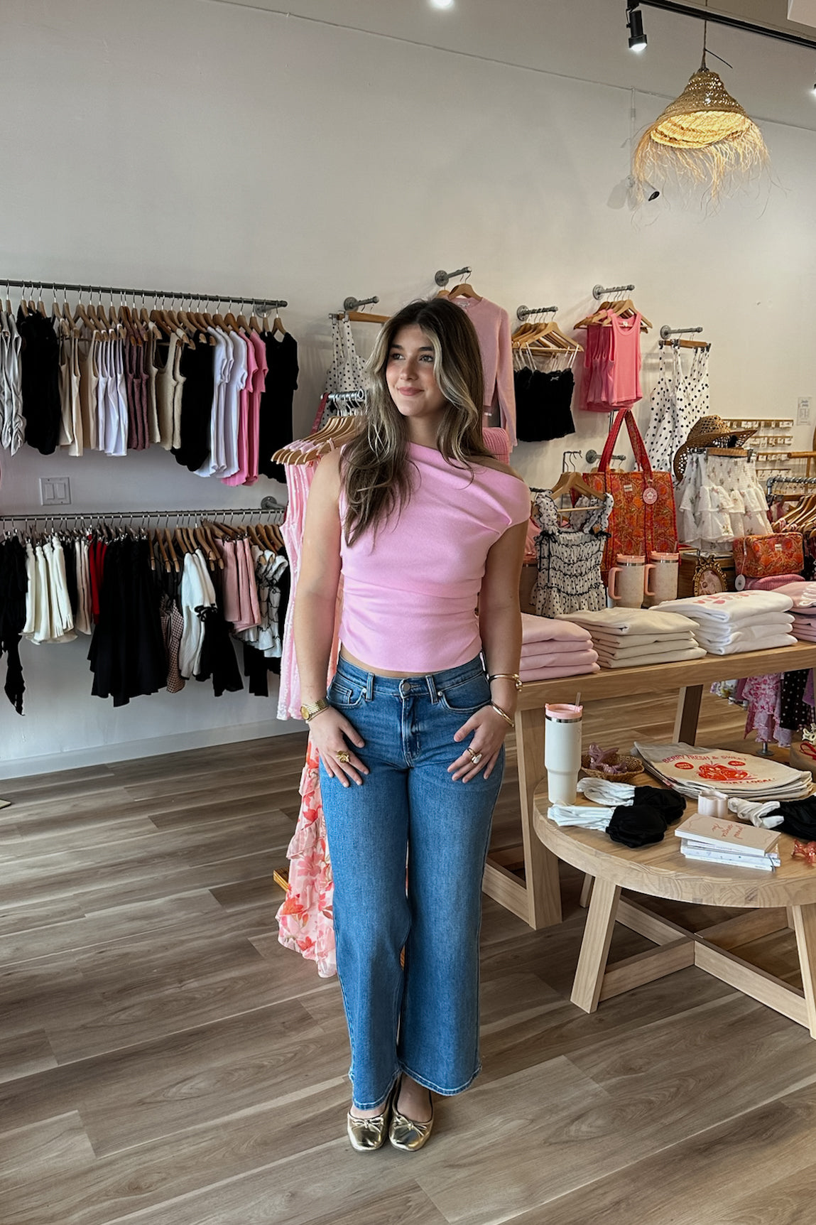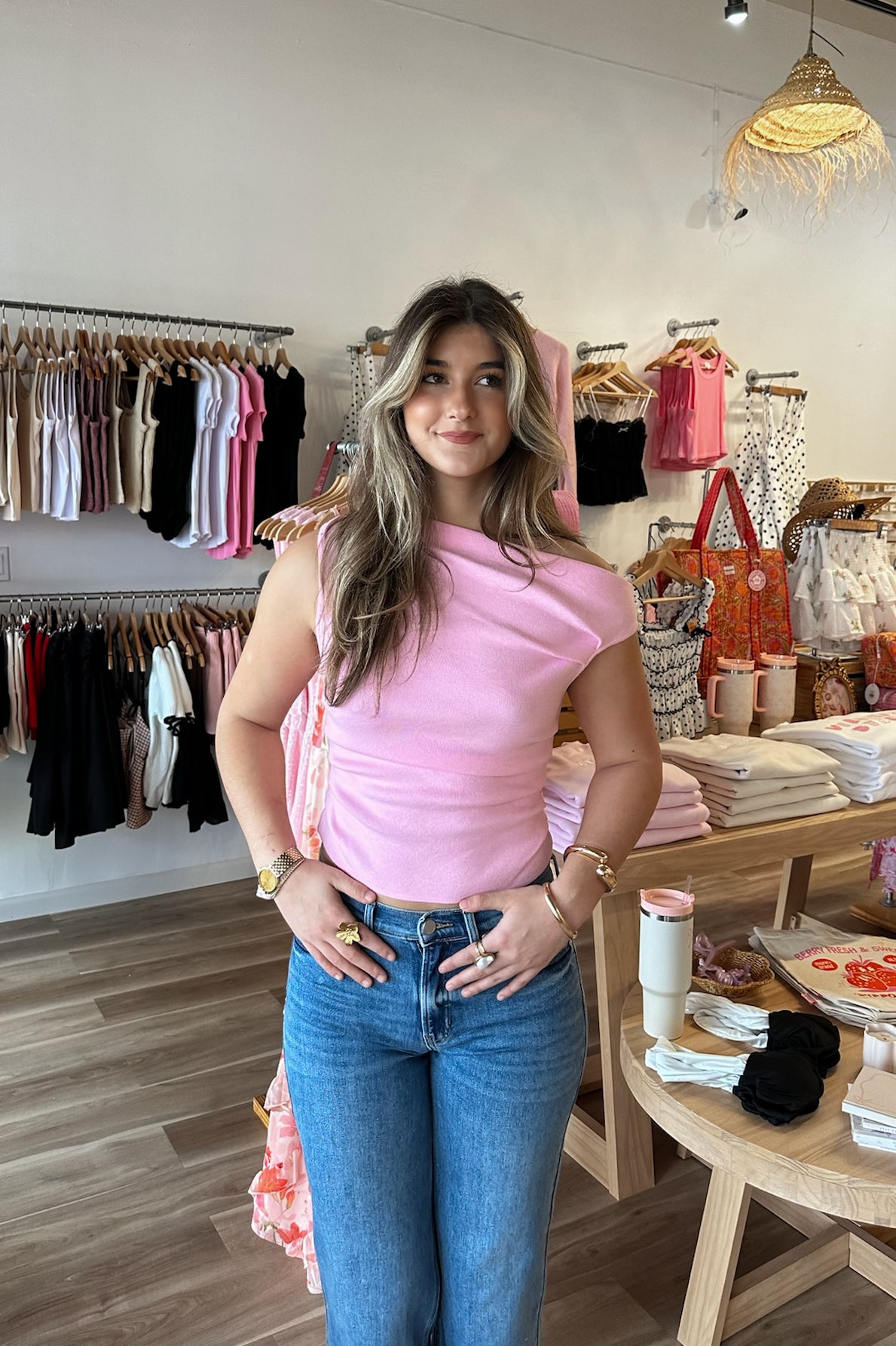 Pink, woven top with asymmetric neckline