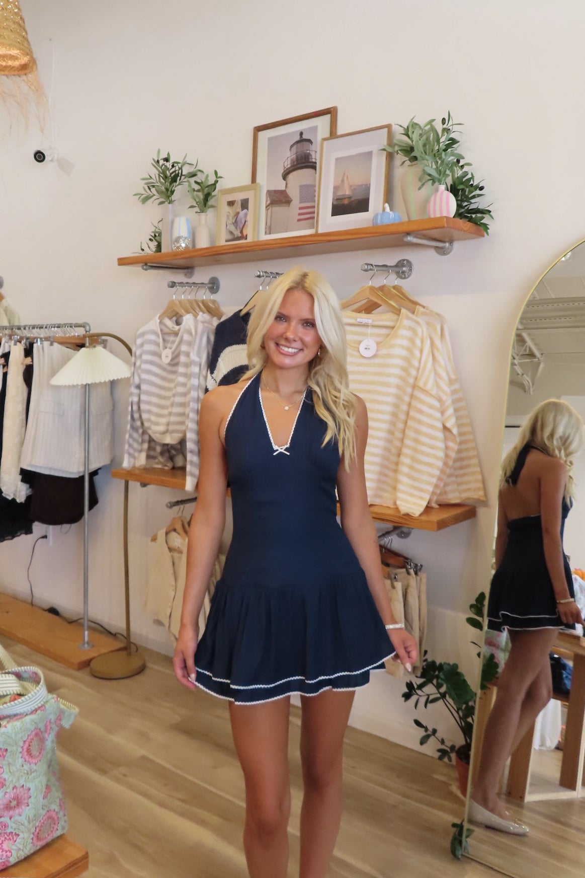 Blue, halter neck mini dress with front bow, lace trim, ruffled tiers, and back zipper