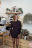 Brown, knit mini dress with boat neckline, open back, fitted silhouette, and long sleeves