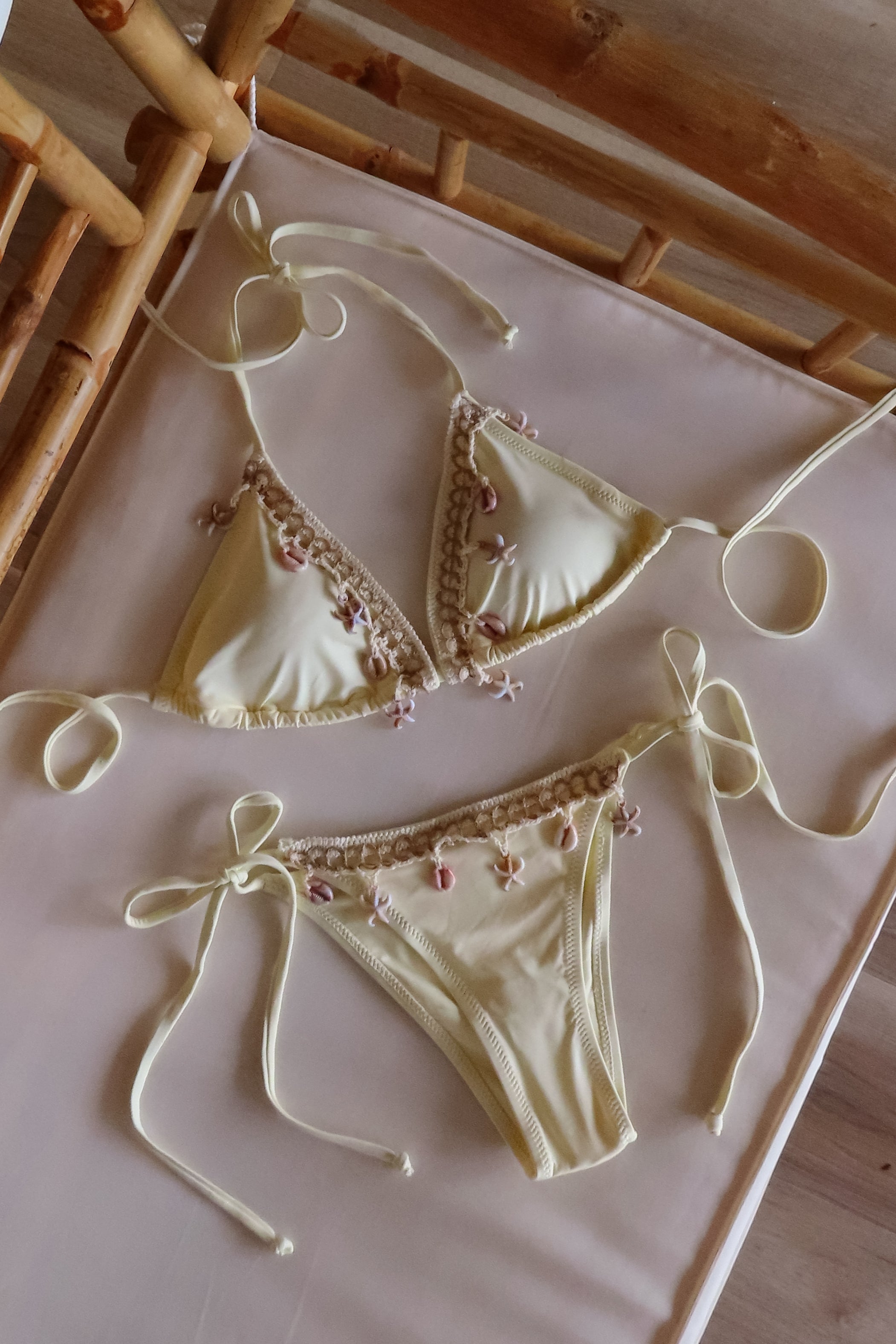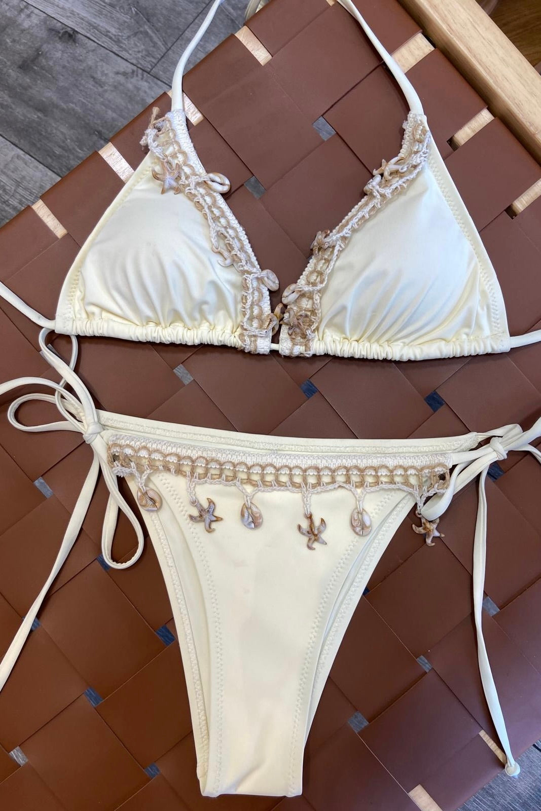 Sundaze Brunch, bikini bottom with seashell and starfish charms, side ties, and cheeky coverage