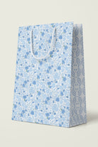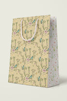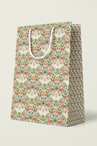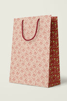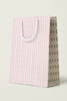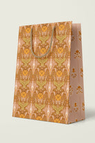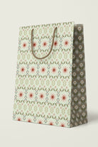 Premium gift bag with a unique pattern accented by a complementary design on the gusseted sides, and soft braided rope handles in coordinating colors