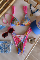 Sundaze Brunch, floral bikini top with gingham contrast, adjustable wide straps, back tie, and slideable triangle cups